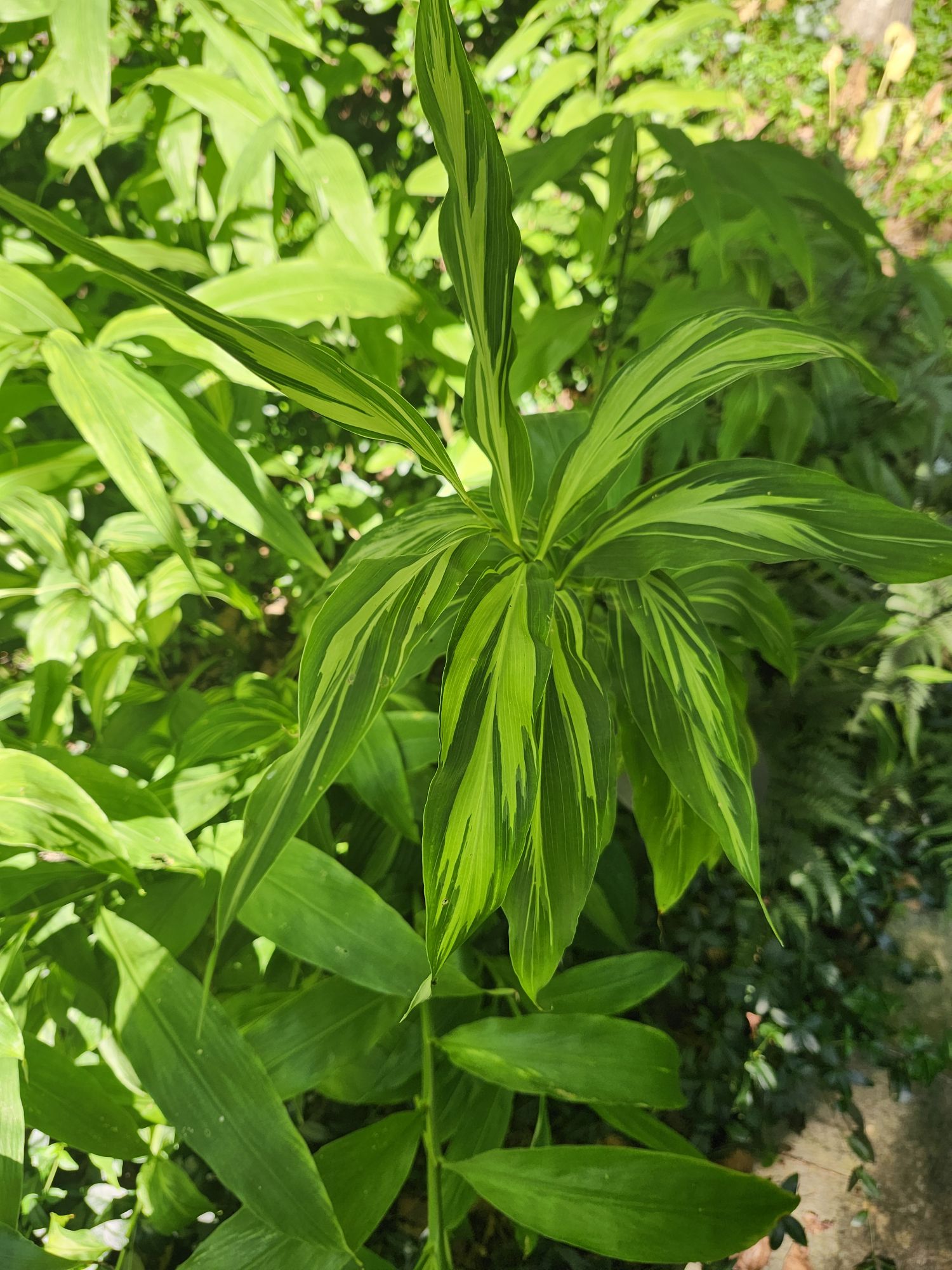 Dancing Crane ginger in the upper rear garden. More green reversions have snuck in, but it’s likely I’ll dig and discard ones that are not variegated.j