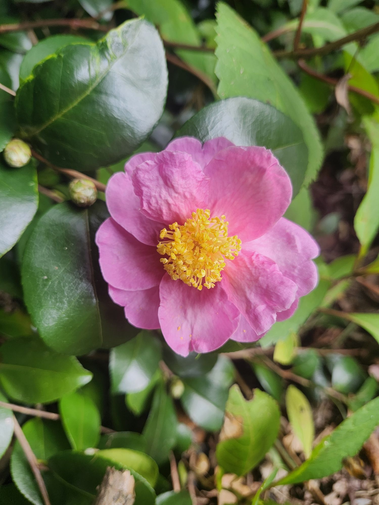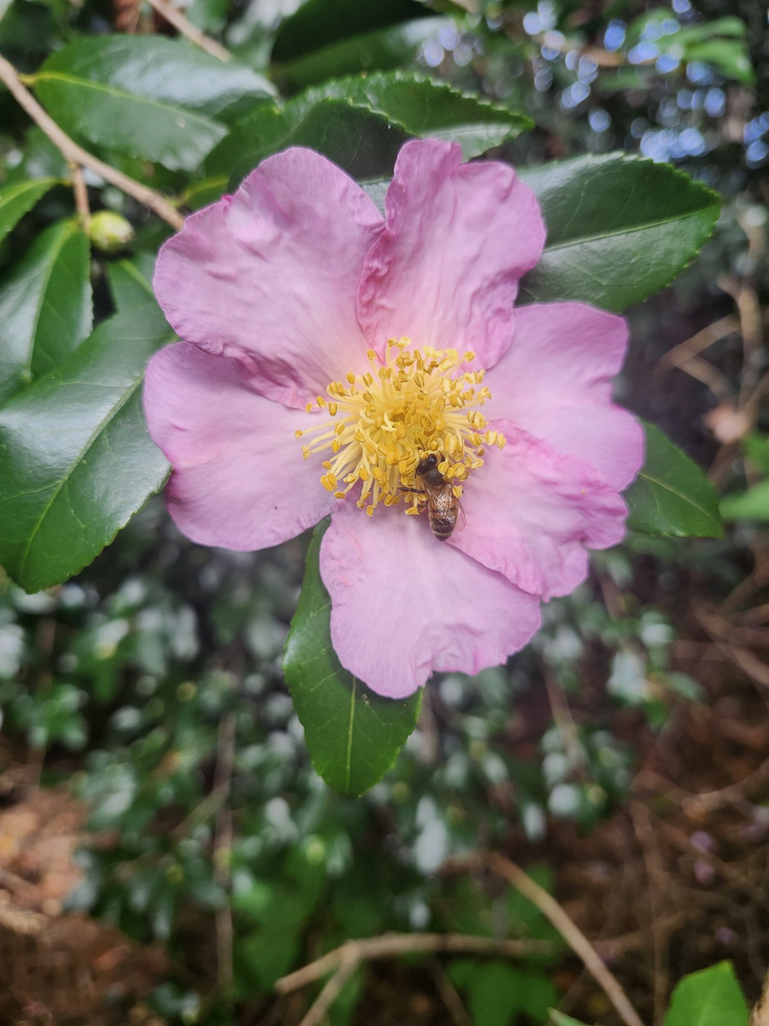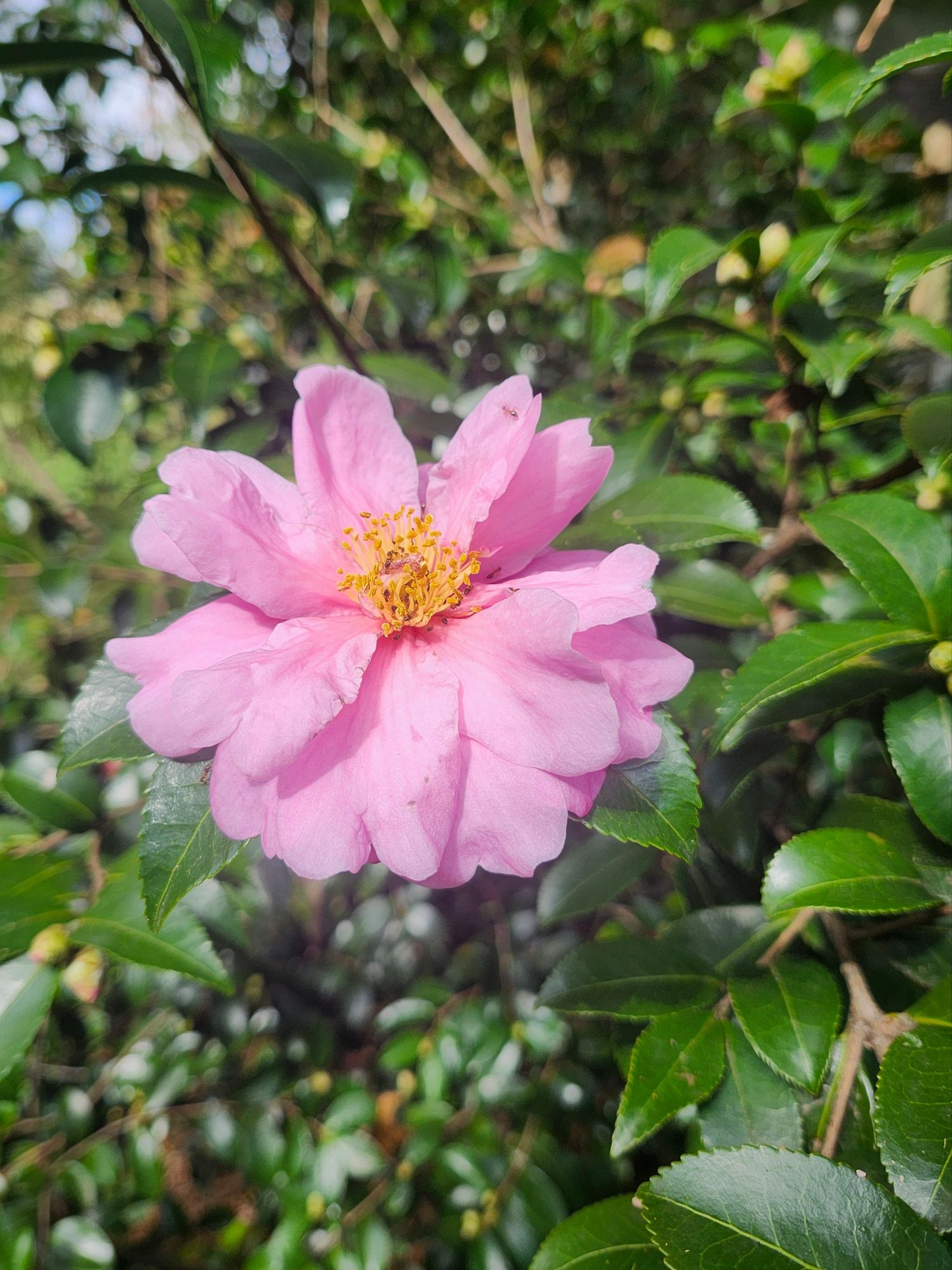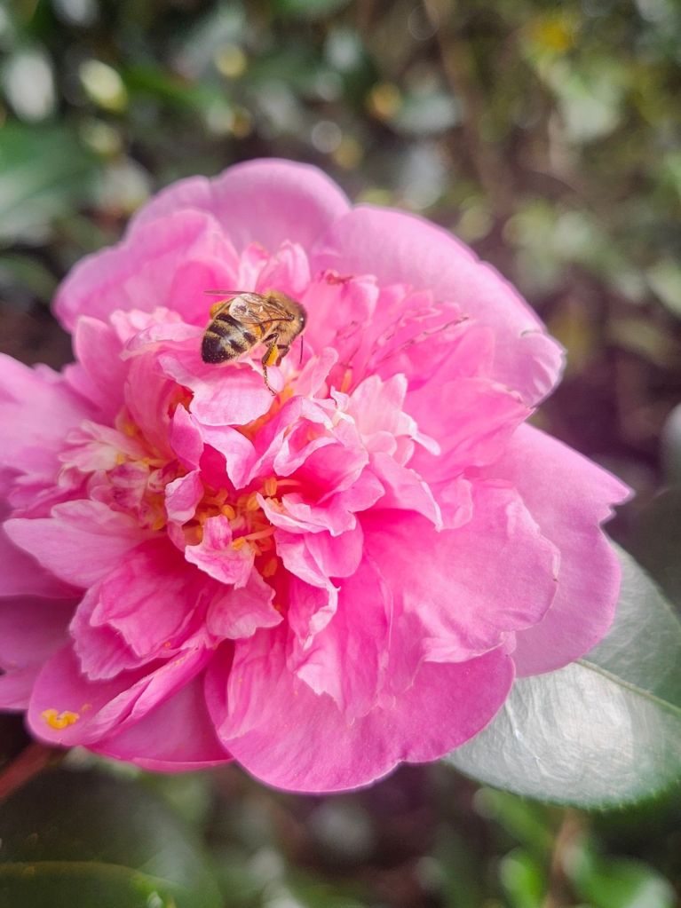 Bees have found today’s few camellia flowers with many more to come in the next month.