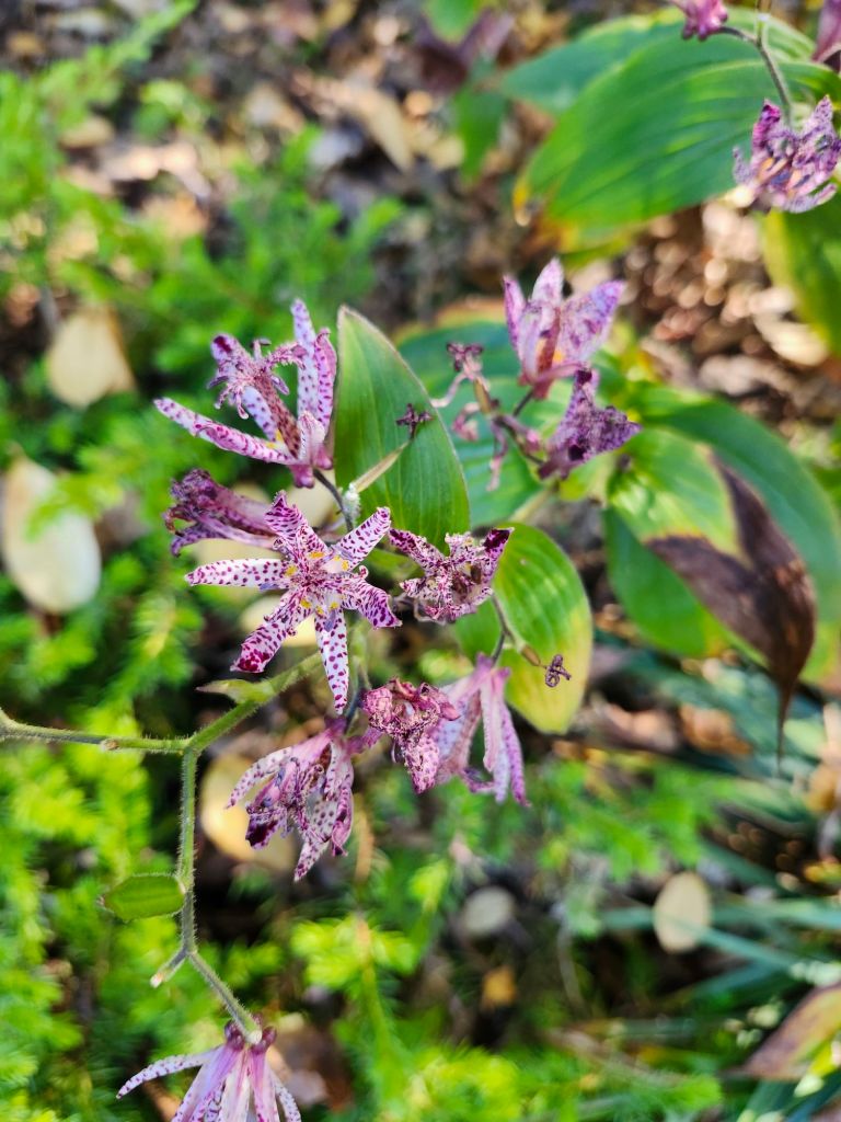 Flowers of several toad lilies (Tricyrtis, below) have persisted through the cold, but the flowering cycle that began in August will end soon.