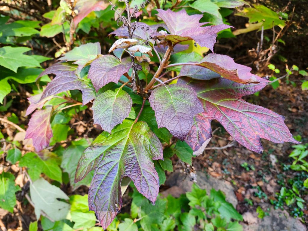 Two Oakleaf hydrangeas (Hydrangea quercifolia, above) that were shaded in the side garden by the Bigleaf magnolia (Magnolia macrophylla) that fell in a late June storm are beginning to change to autumn colored foliage. In deep shade the leaves remained green, but there are now a few hours of sun.