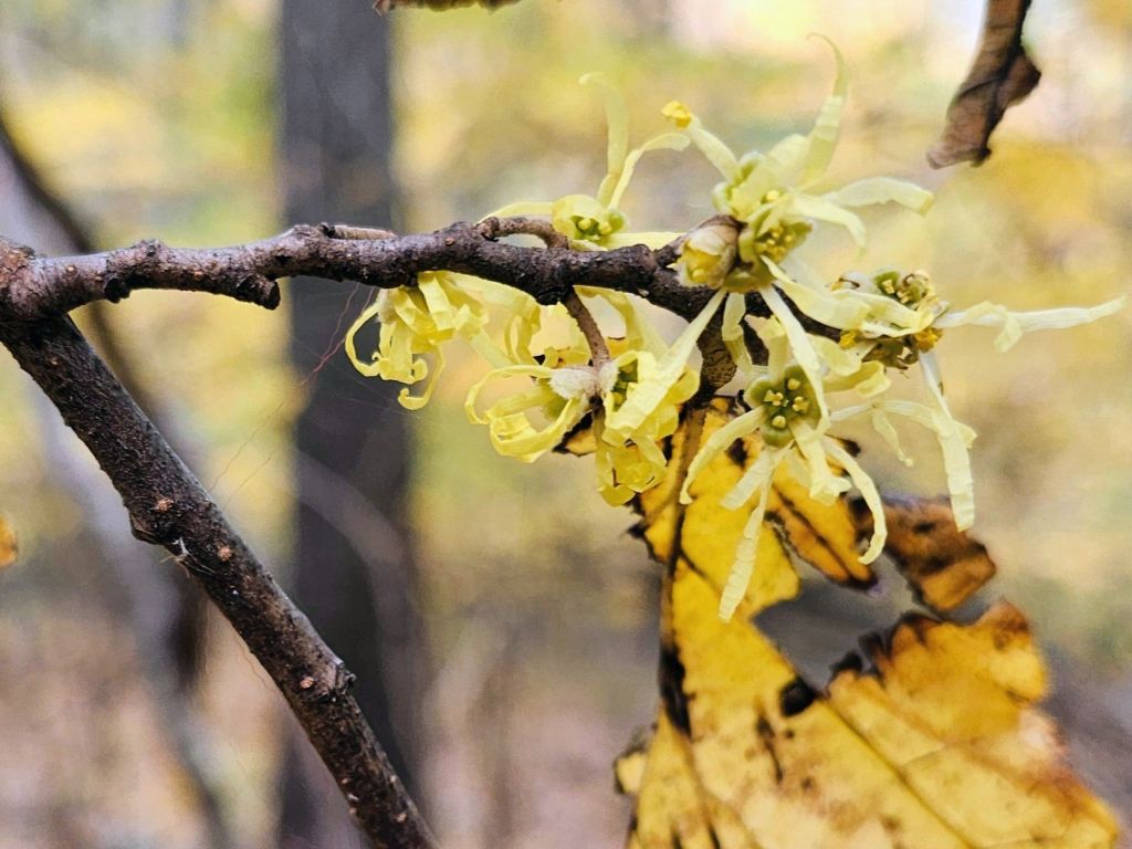 The native witch hazels (Hamamelis virginiana, below) in the garden have started to flower a few weeks after the first blooms were seen on higher elevation hikes. I suppose that flowering is triggered by cold rather than hours of sunlight, and of course, earlier autumn flowering in the mountains is the reverse of what we see in the spring.