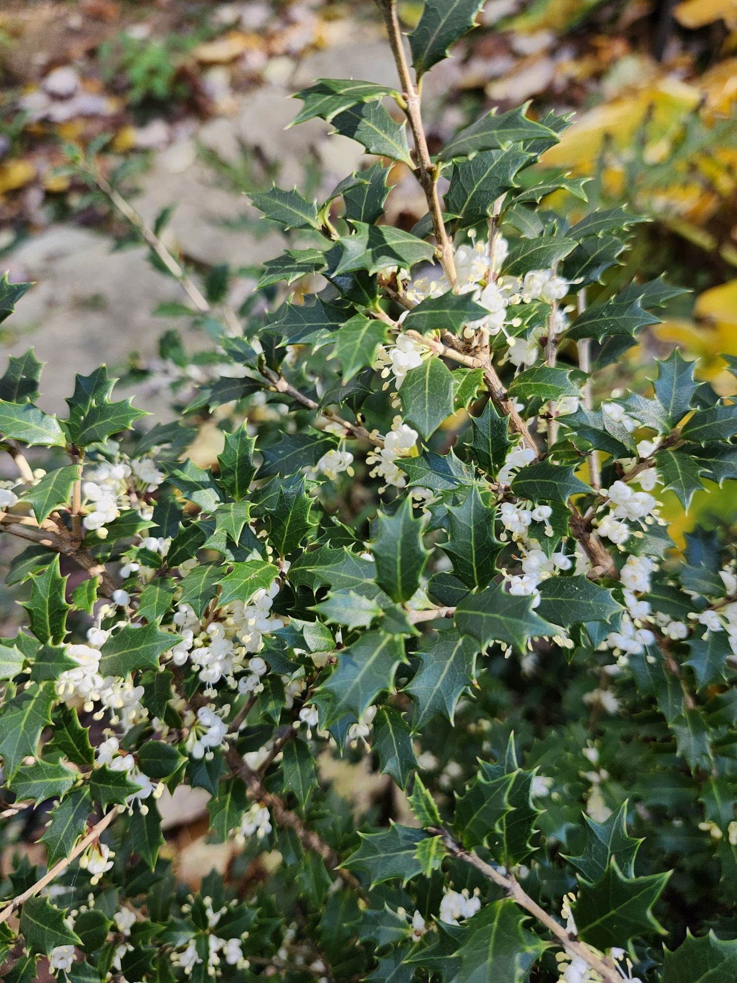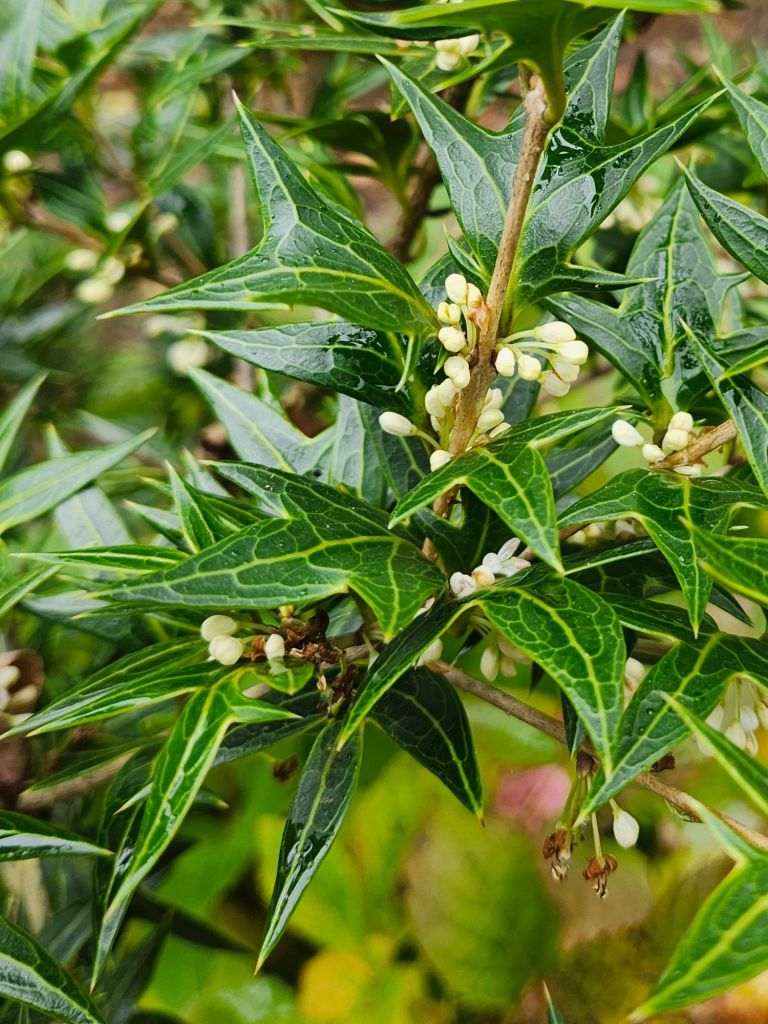 There is little hope that flowers of two Osmanthus (above and below) in the garden will be pollinated. A few bees were seen on autumn flowering camellias several days ago, but in the first week of November temperatures should only get colder. Of course, this is near the northern edge of osmanthus’ cold hardiness. No doubt, bees are more active in milder areas.