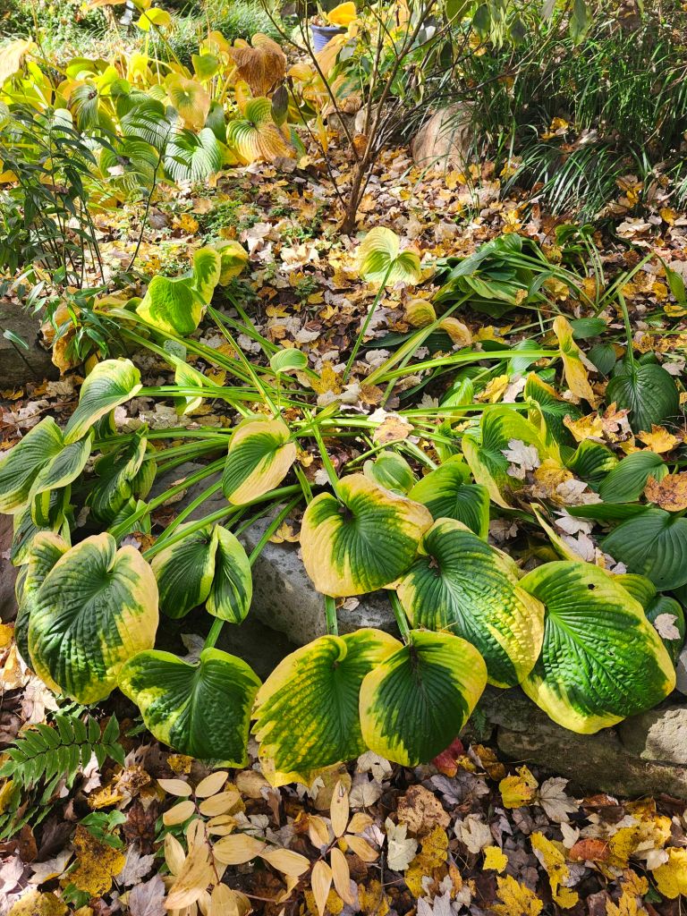 The tall hostas have collapsed following the recent freeze while ones closer to the soil have not. The color remains in a few, even ones that are now prostrate with the exception of the many seedlings of the blue-green Hosta sieboldiana ‘Elegans’ that are now a sickly yellow. Preparing for winter’s cold, their sad appearance is excused.