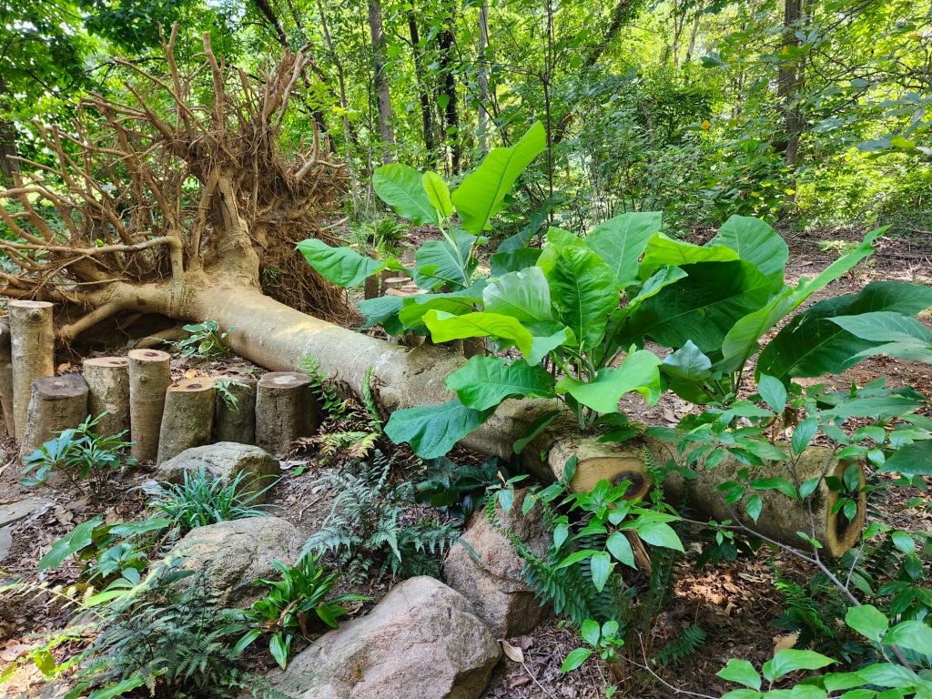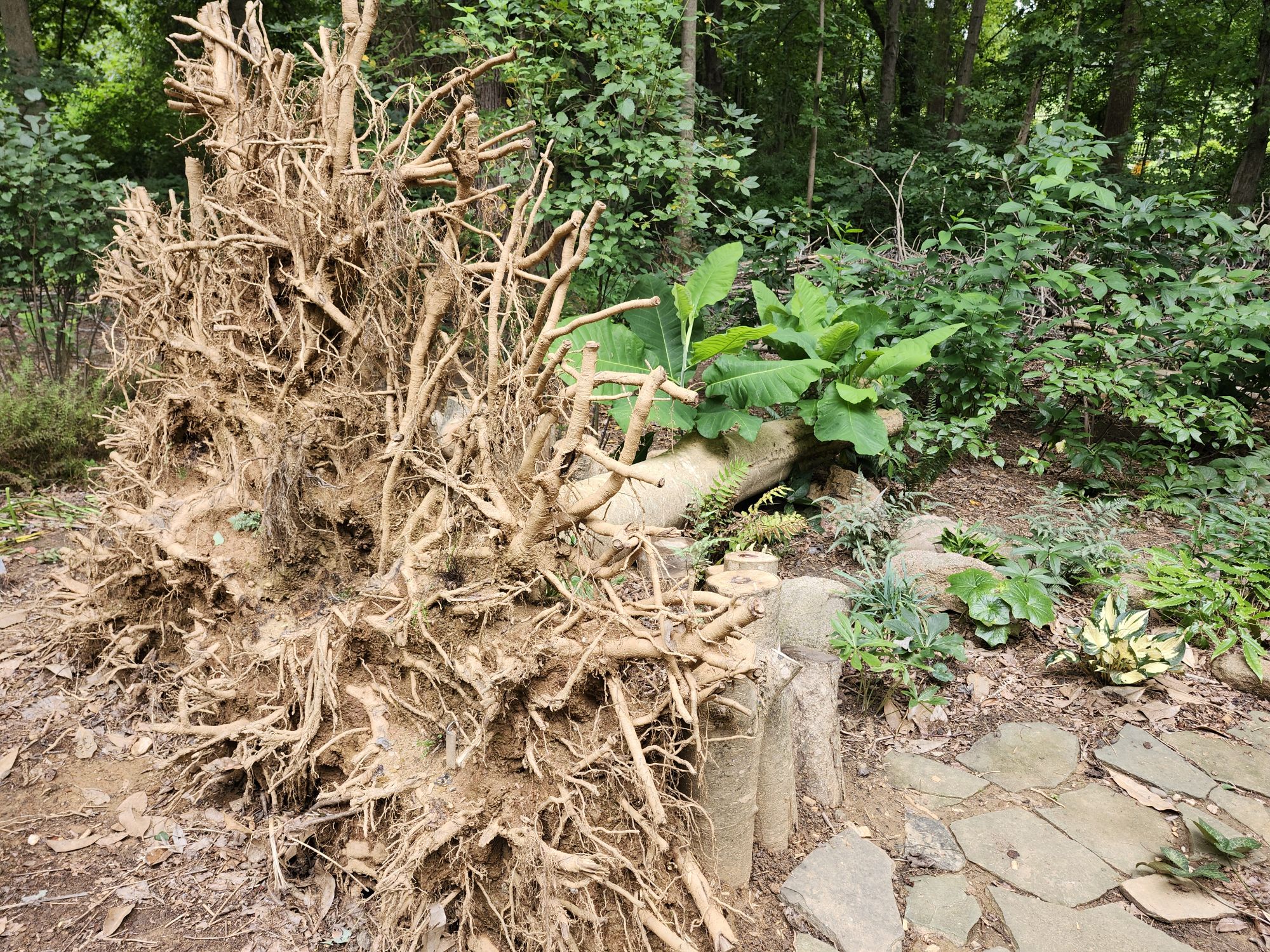 Thankfully, the fallen magnolia caused little damage to the side garden, breaking only a few branches on a neighboring colony of sweetshrubs (Calycanthus floridus) and falling in an advantageous direction to showcase the new stumpery.
