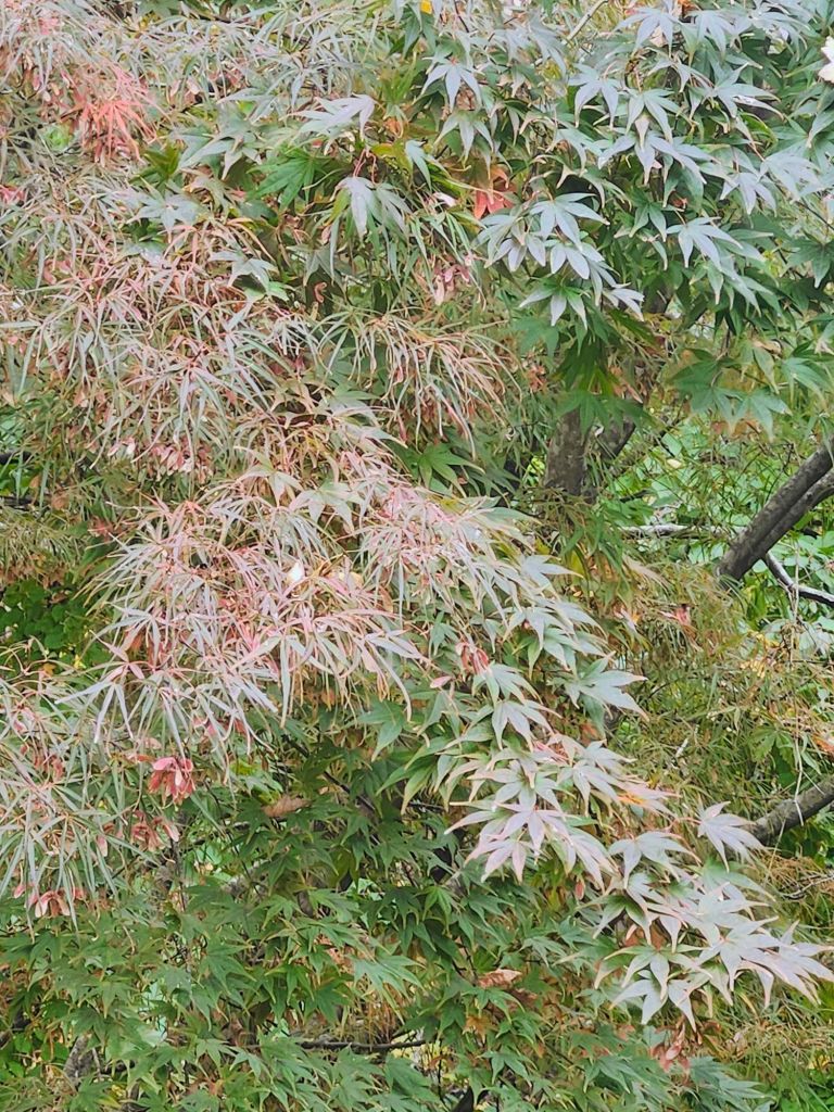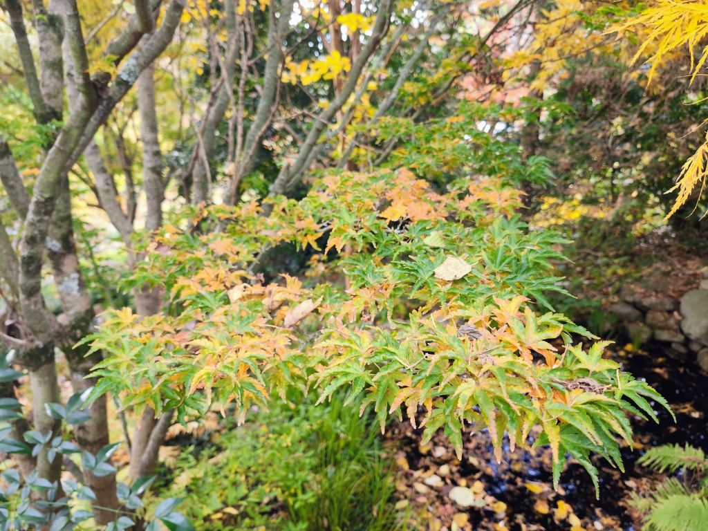 Beneath the tall forest canopy, Japanese maples provide a variety of foliage colors (above). A few maples are nearly bare in early November, some are at peak color, and others are just beginning their autumnal display.