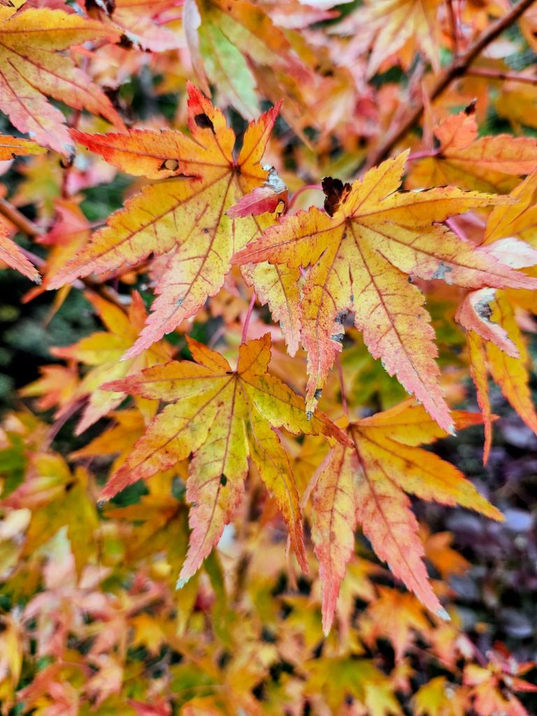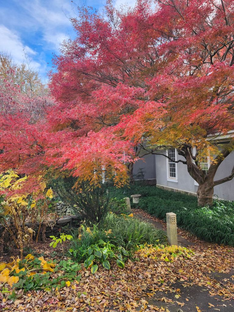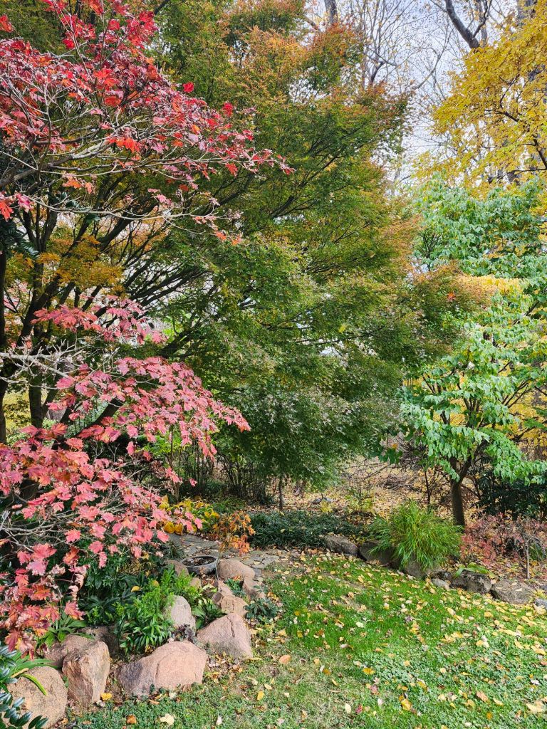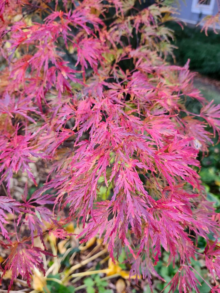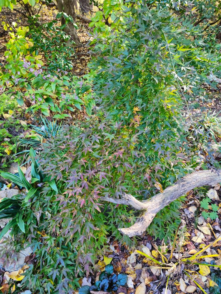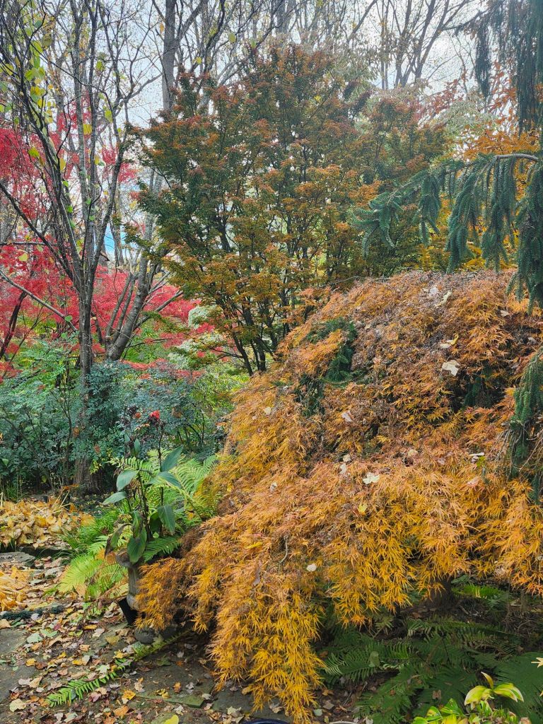 The view from the sunroom is its most colorful, though not the best as I know that next up is the bareness of winter. The densely branched Lion’s Head Japanese maple (Acer palmatum ‘Shishigashira’, above) shows only the slightest change for another few weeks while three red leafed maples have darkened considerably from their faded late summer coloring.