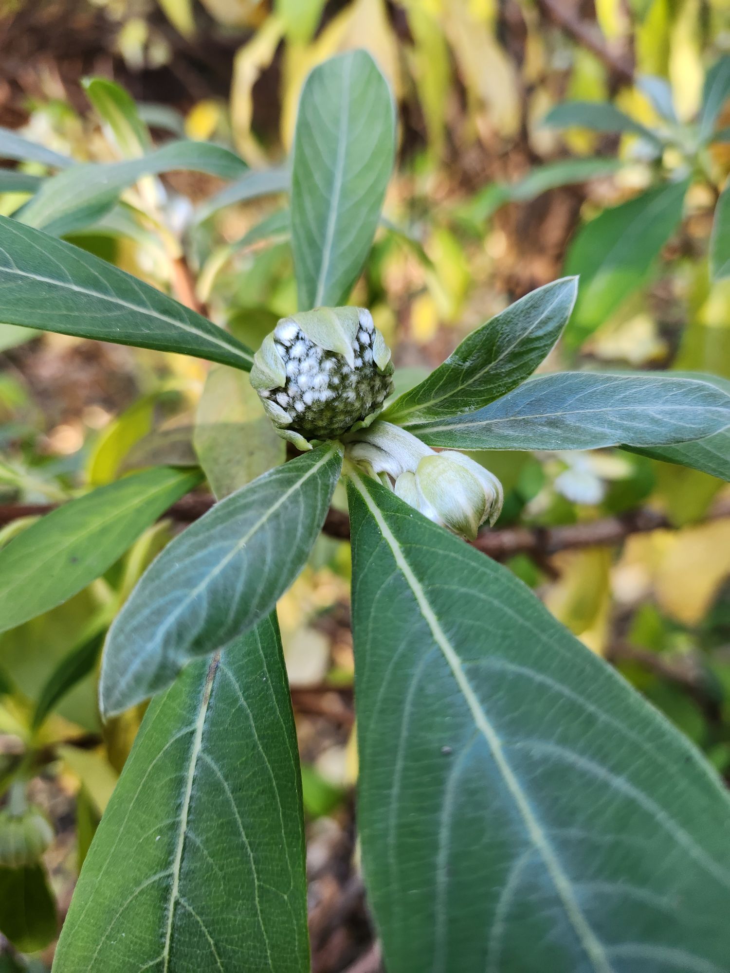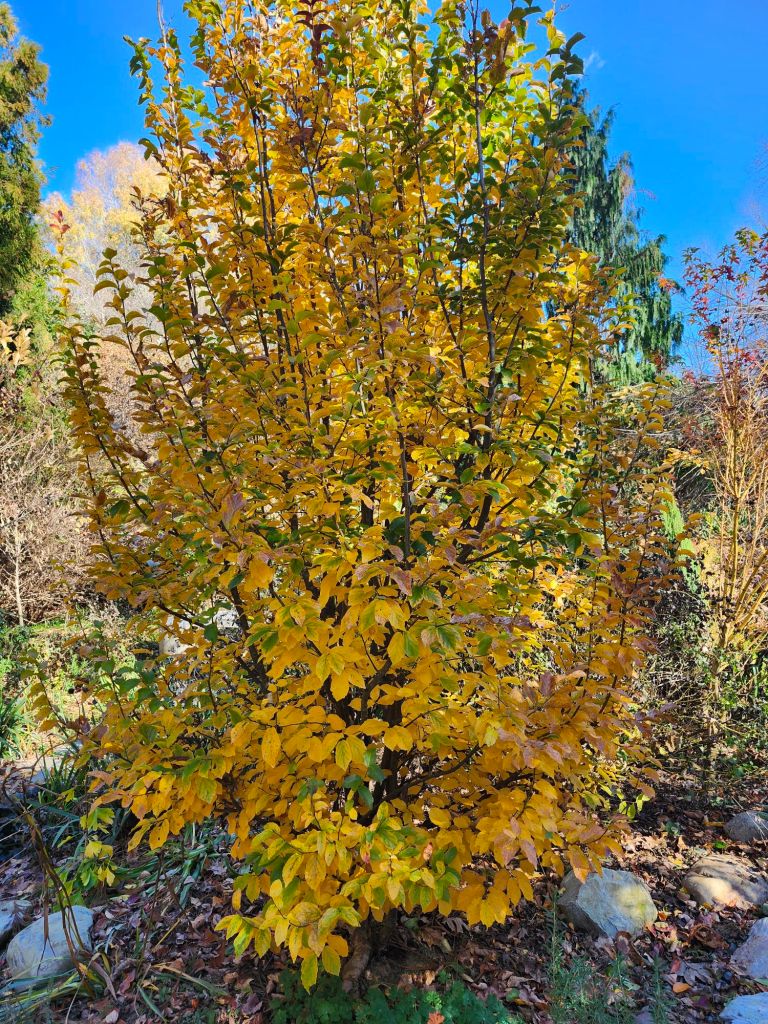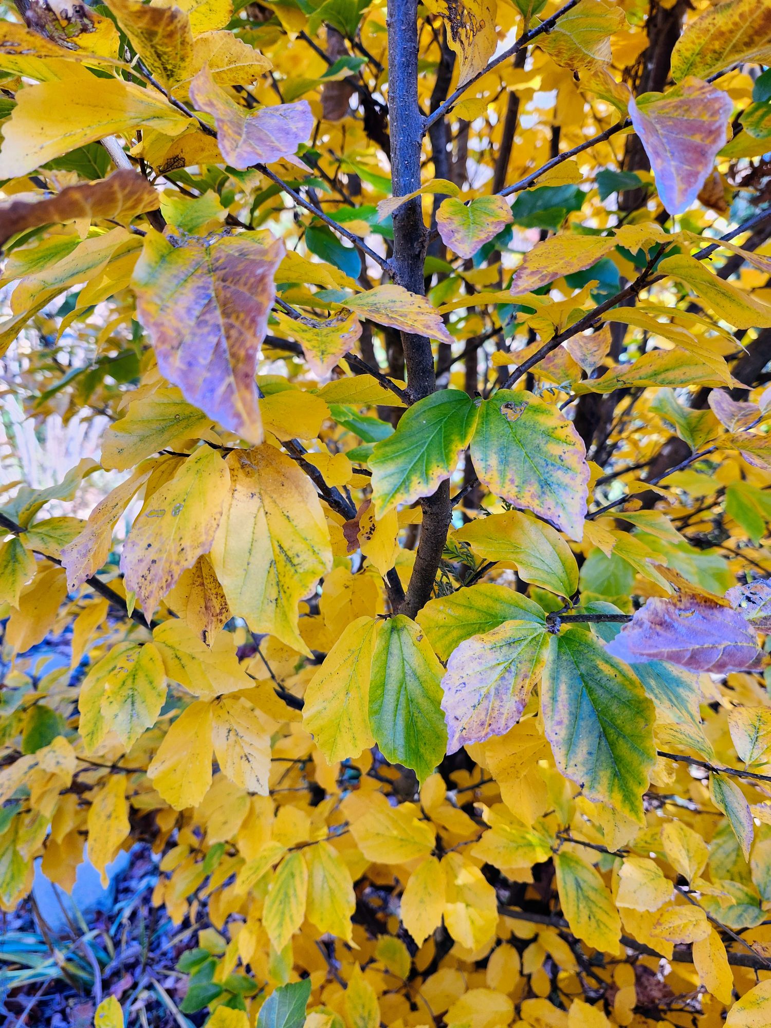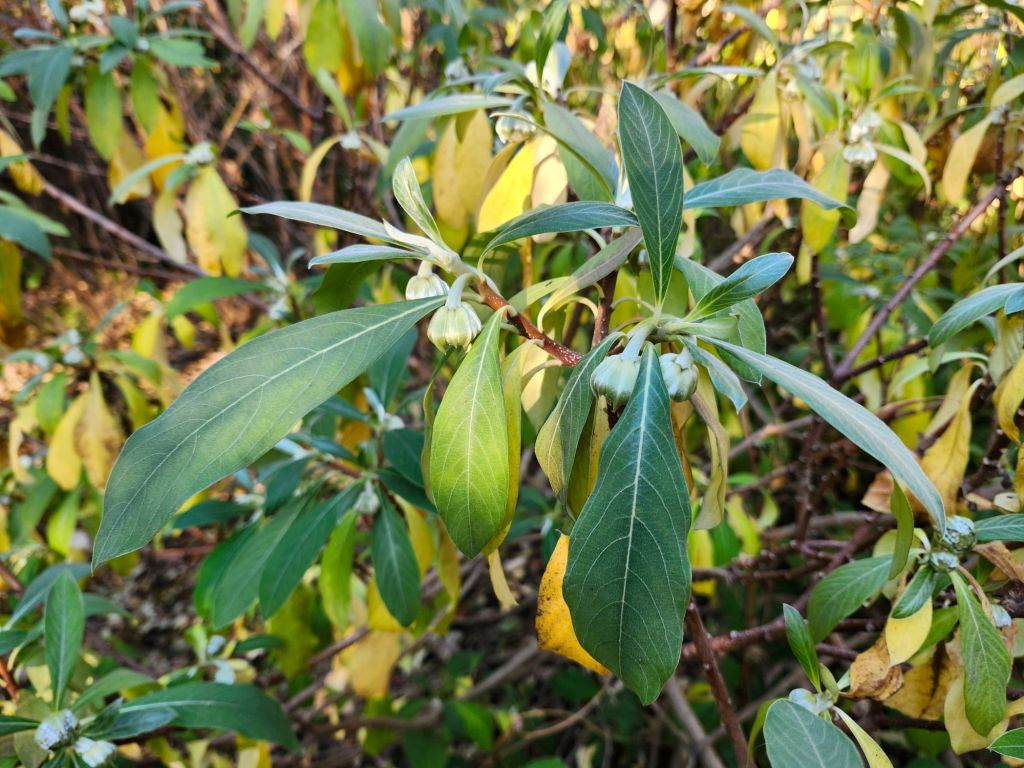 While the ginkgos’ brilliant yellow stands out, other yellowing leaves appear as if the life is draining away before winter dormancy. The fading yellow foliage of the paperbushes (Edgeworthia chrysantha, below) draws the eye only because of the shrubs’ huge size. Soon, the domed canopy of bare stems will stand out with silvery flower buds that will slowly swell until flowering in February.