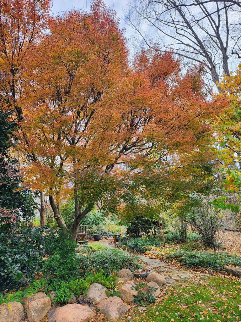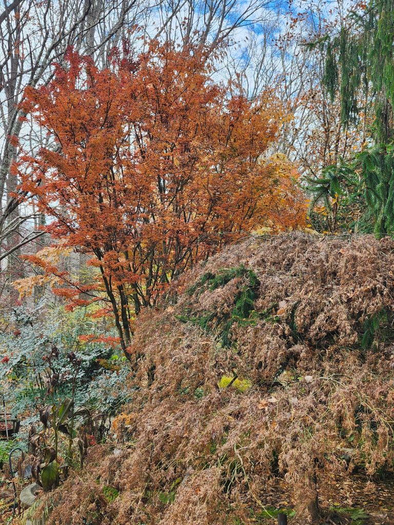 In mid-November leaves remain only on a few trees in the garden. Two Japanese maples are notable exceptions to the bareness. Today, both display their splendid autumn coloring. It’s likely that the curled green leaves of ‘Okushimo’ (above) and ‘Shishigashira’ (below) do not stand out through the year to most visitors, but now, their color is conspicuous.