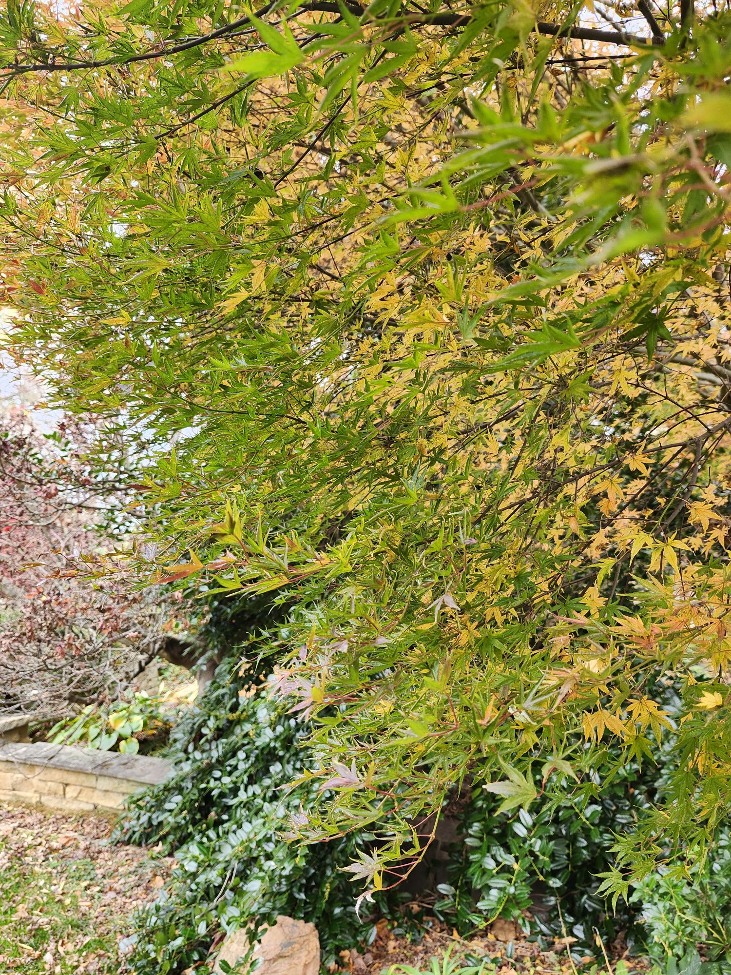 While ‘Okushimo’ grows to an upright, spreading tree similar to many other maples, ‘Shishigashira’ is very upright with tiered branches and clusters of foliage. Both Japanese maples are late to change to autumn coloring and both hold their leaves weeks later than other maples.