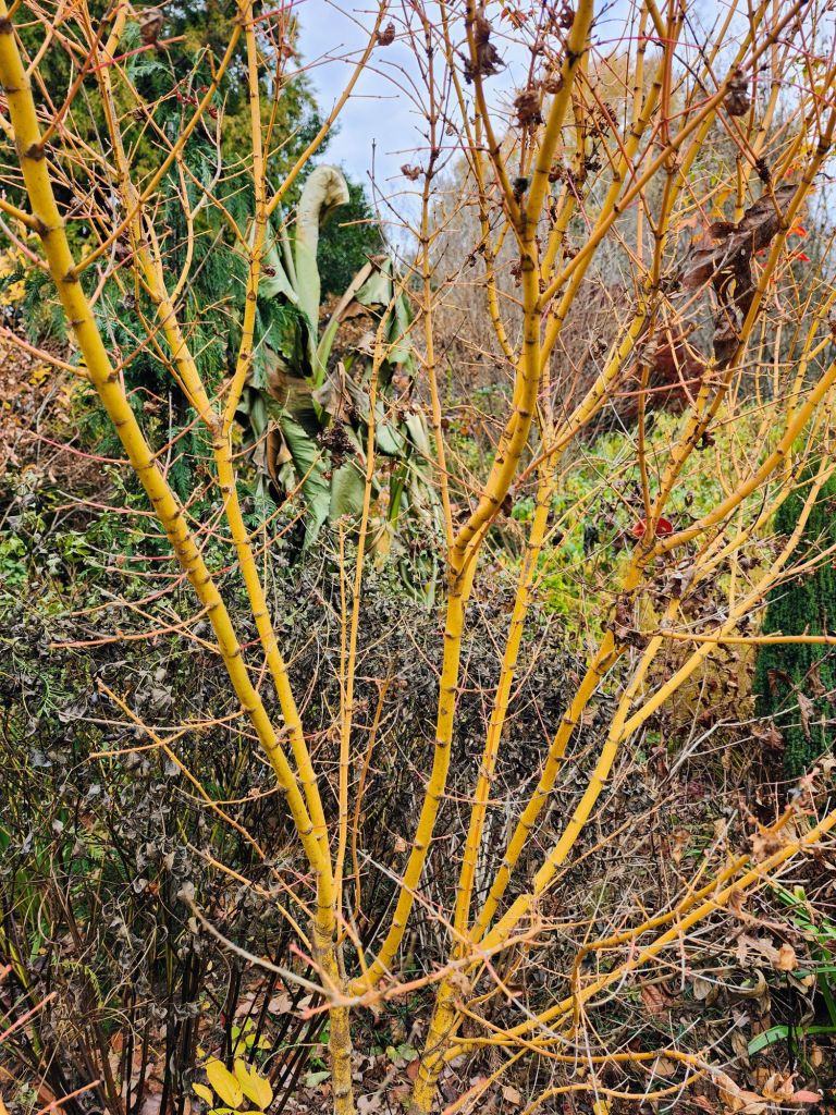 Autumn foliage color is far down the list of criteria that I evaluate in a plant for inclusion in the garden. Often, my selections are driven by emotion upon seeing a tree while visiting a garden, though a bit of research is certain to follow. A time or two I’ve been tempted by foliage color or brightly colored winter stems (Acer palmatum ‘Bihou’ with bright yellow stems, below), but the colors and forms of spring and summer influence most decisions.