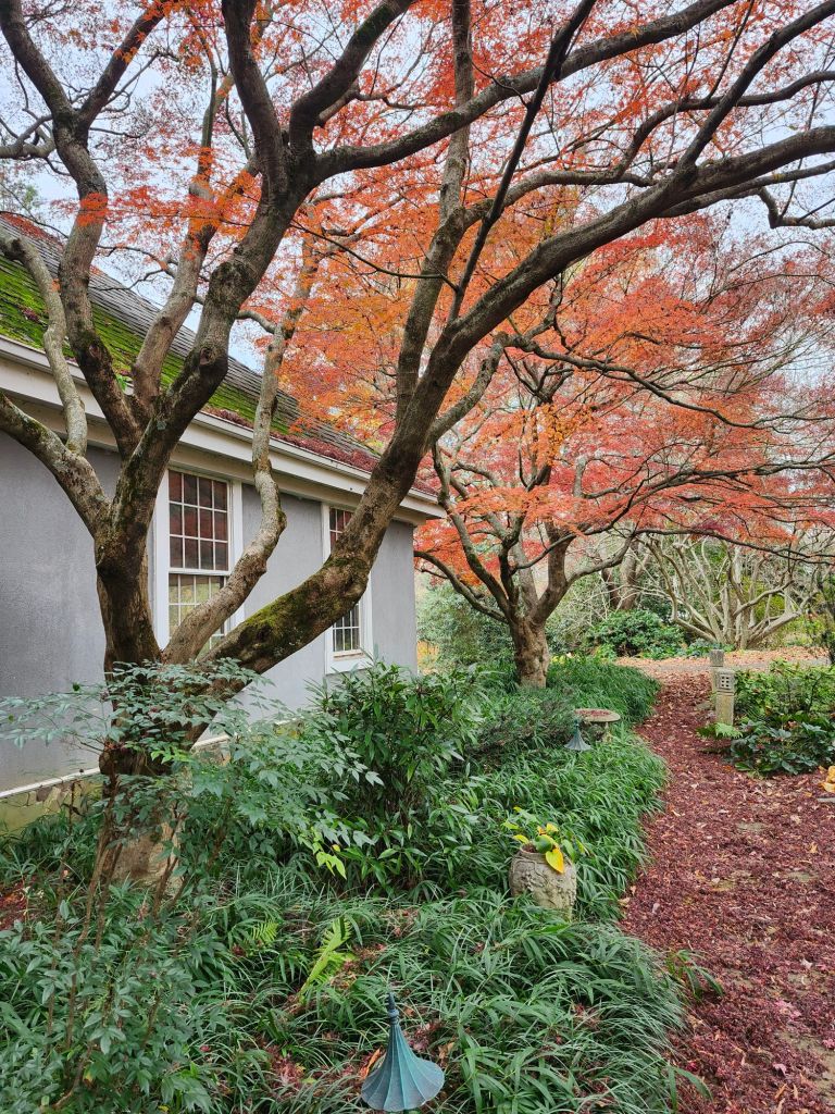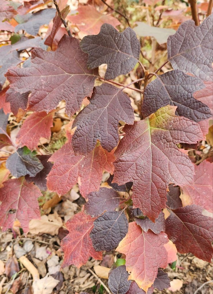 The sprawling Oakleaf hydrangea (Hydrangea quercifolia) beside the koi pond patio is quite shabby. Deer feasted on one side of the large hydrangea in the summer and it started new growth, then stopped. It will be fine by spring, but its foliage color is often splendid through December. But, a few Oakleafs in the side garden (above) have colored beautifully with more sun since the magnolia fell, and the yellow leafed ‘Little Honey’ is showing some color, for once. While most leaves are falling, the Oakleafs will often hold on until the new year.
