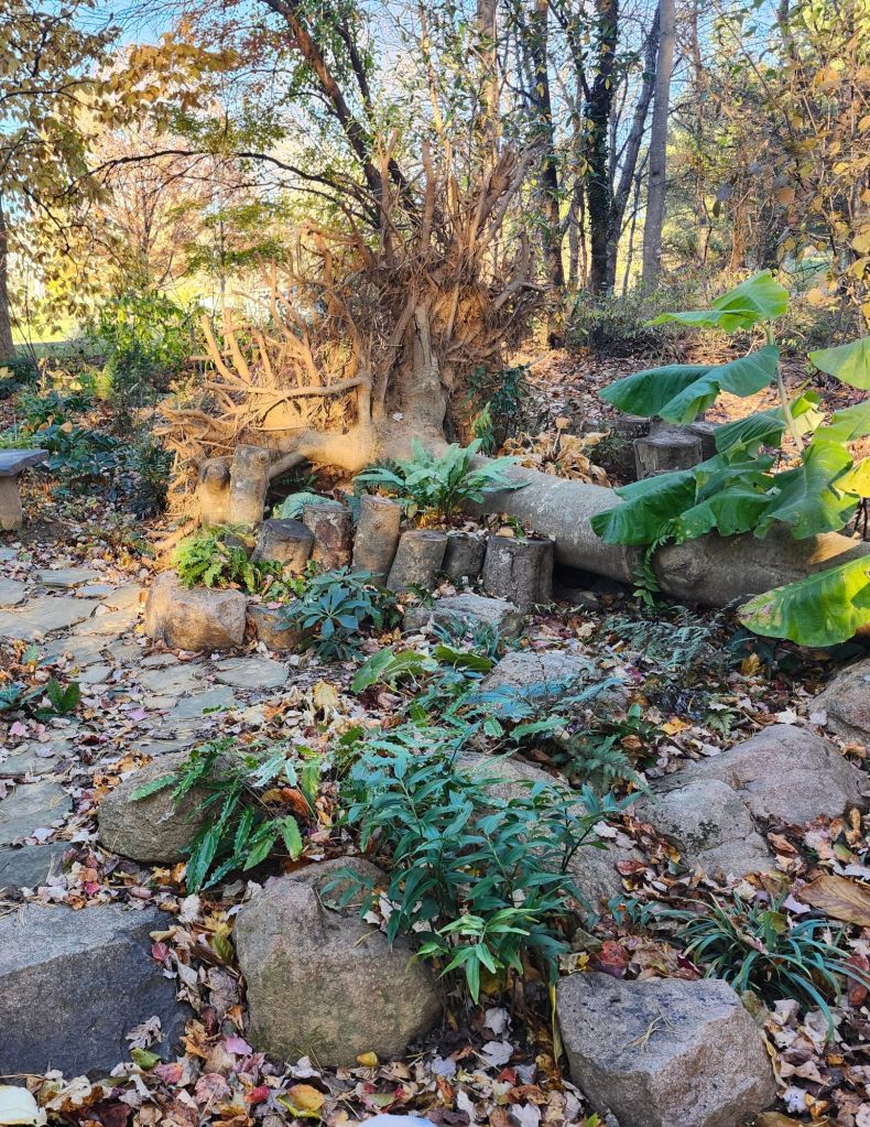 The addition of the small stumpery is the most prominent change since the Bigleaf magnolia (Magnolia macrophylla) fell in a late June storm, but there’s more. The side garden had long been a bit sparse, but the huge magnolia dominated the space so the lack of fullness was excused.