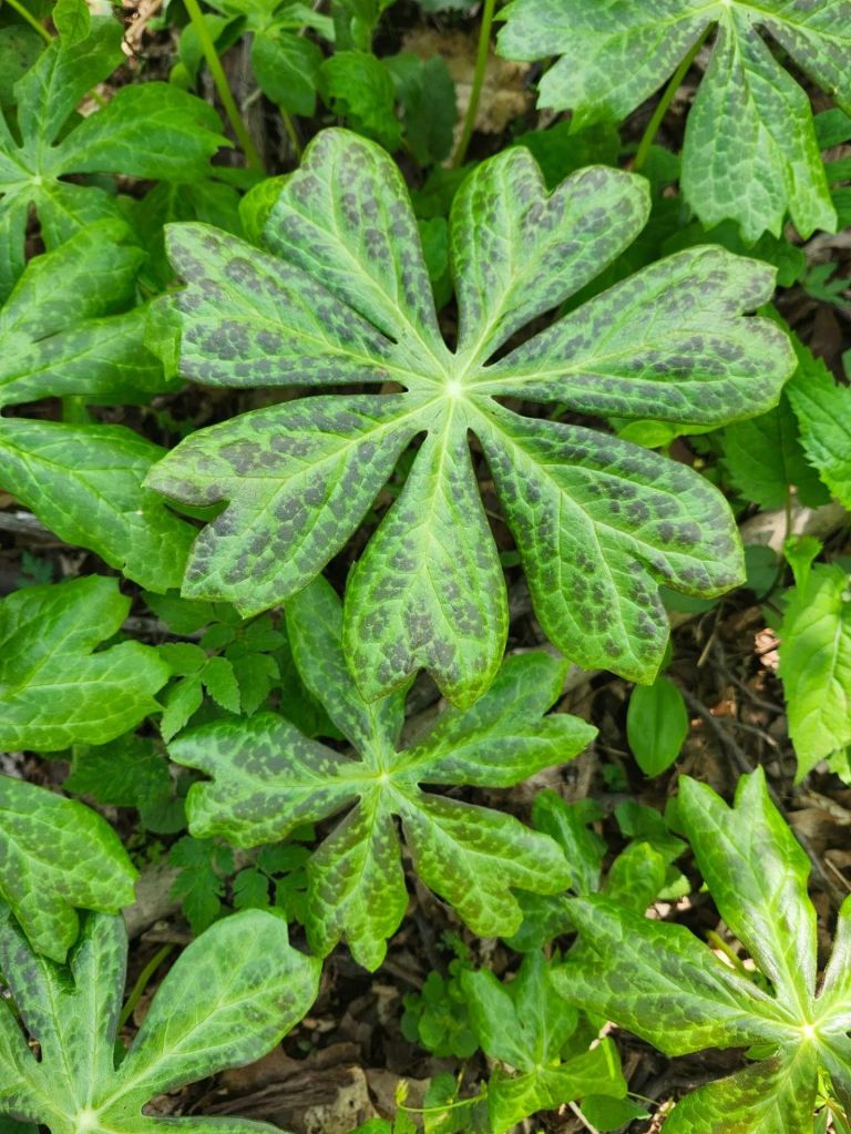 When transplanting mayapples from the neighboring forest I selected ones with mottled coloring. Many Asian mayapples have larger leaves and distinctive coloring. As always, I hope that this garden inspires others as I’m inspired seeing other gardens.