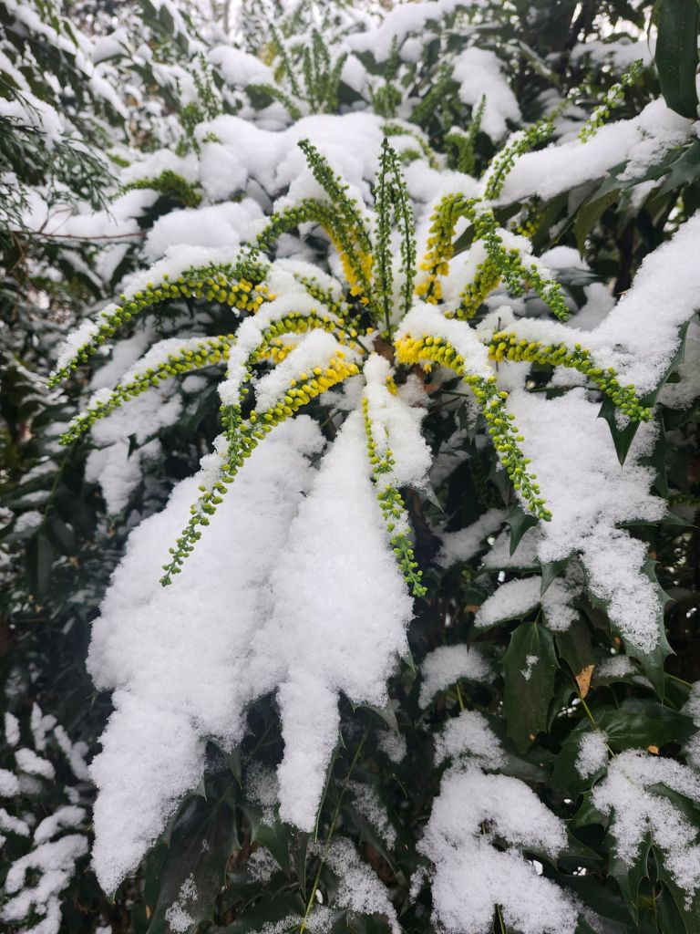 Flowers of ‘Winter Sun’ mahonias (Mahonia x media ‘Winter Sun’, now Berberis x hortensis, below) are nearing their peak this first week of December, and as expected, the blooms are not injured in the cold. Flowers might be damaged if temperatures fall below ten degrees, but the blooms persist longer in colder temperatures (but not extreme) than in periods of mild winter weather.