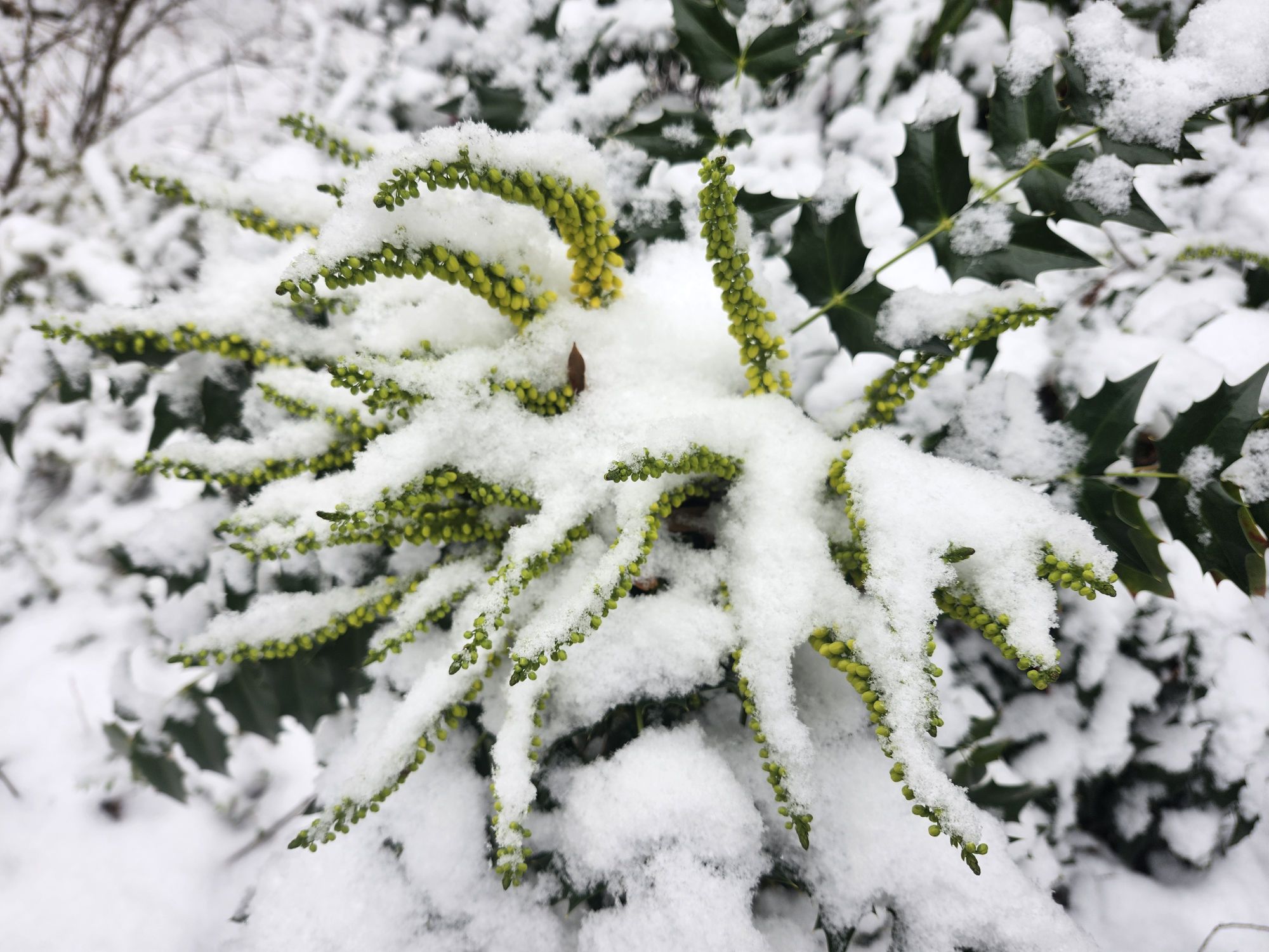 Columnar and multi-branched shrubs are most susceptible to snow damage. The backside of a leaf rake is very effective in dislodging snow without damaging the shrub. Today’s concern as I slip slided through the garden, was not falling on my backside.