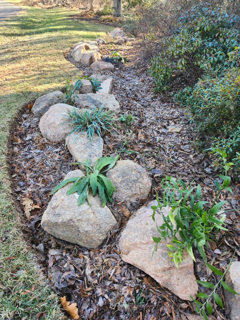 I planned to wait on the planting until March, but I’ve been impatient to get moving after finally splitting two large boulders that were far too large for me to move. Eight tons of boulders were dumped several weeks ago. Most were rolled or carted and dug into place along the expanded front border without much struggle, but the two monster boulders were drilled, wedged and thumped repeatedly with a sledgehammer to split into more manageable pieces. One sledgehammer met its demise, but a new, sturdier version finished the job.