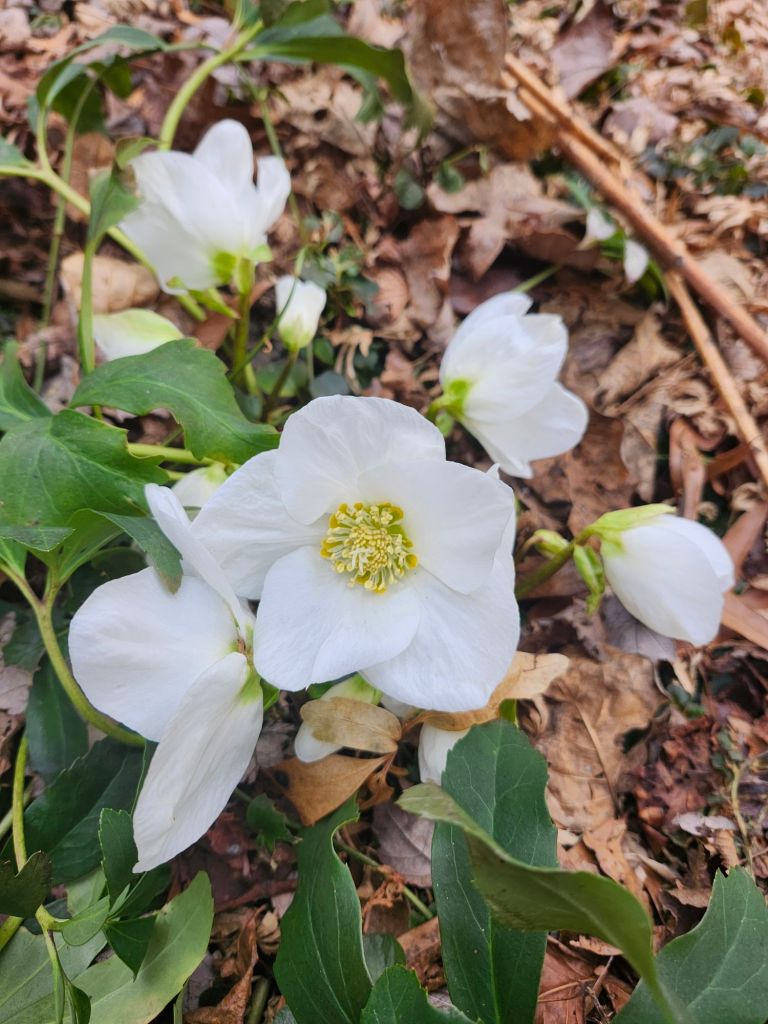 Several mild days have encouraged me to get out to divide and transplant crested irises, two orchid varieties, black mondo grass, disporopsis, hellebores, and a few others into the expansion of the front garden border that was begun in December. The front of the border was long ignored and difficult to see from the road with a downward slope and overhanging Japanese maples. The addition is long overdue though the timing to get started is less than ideal.
