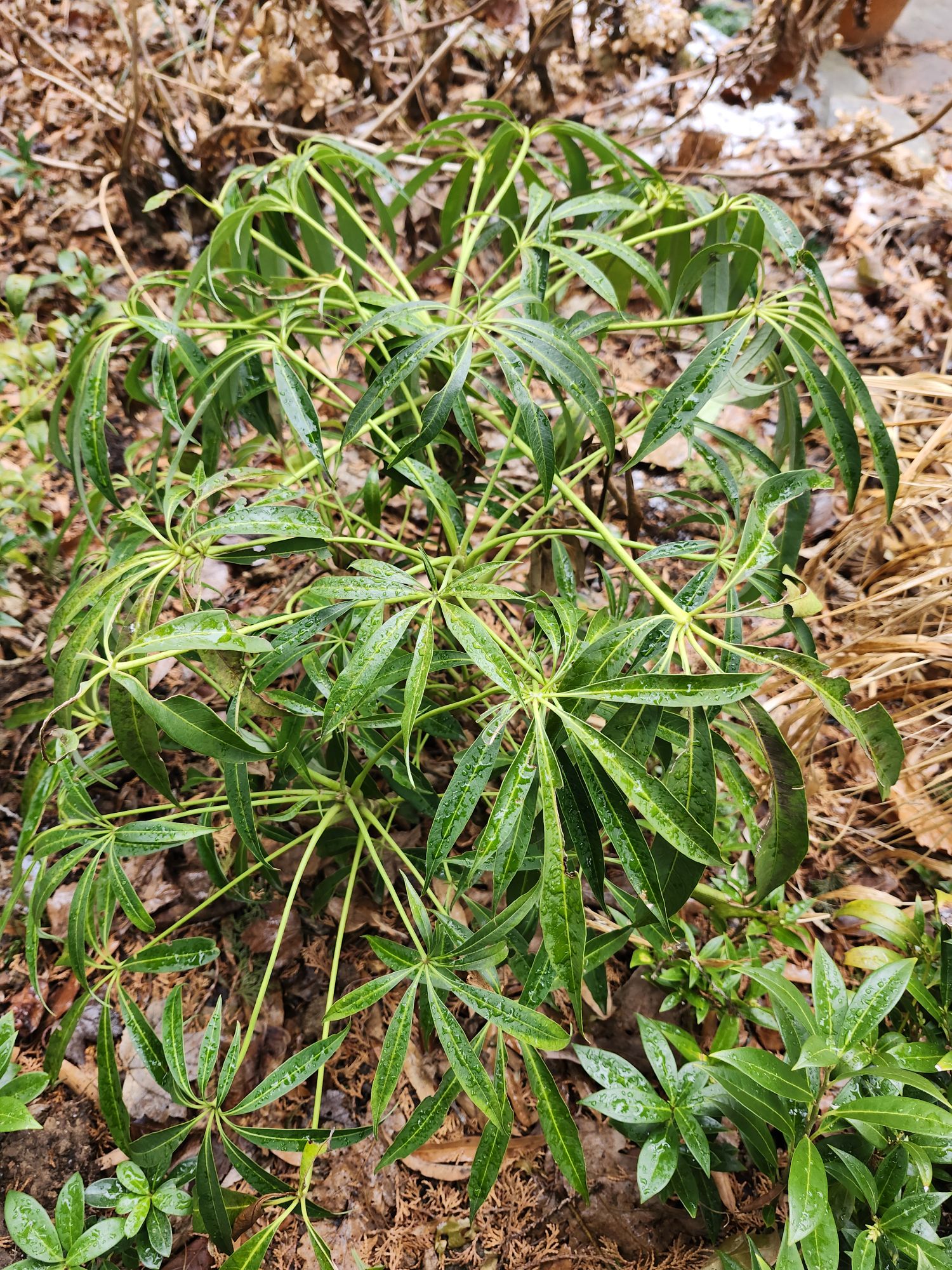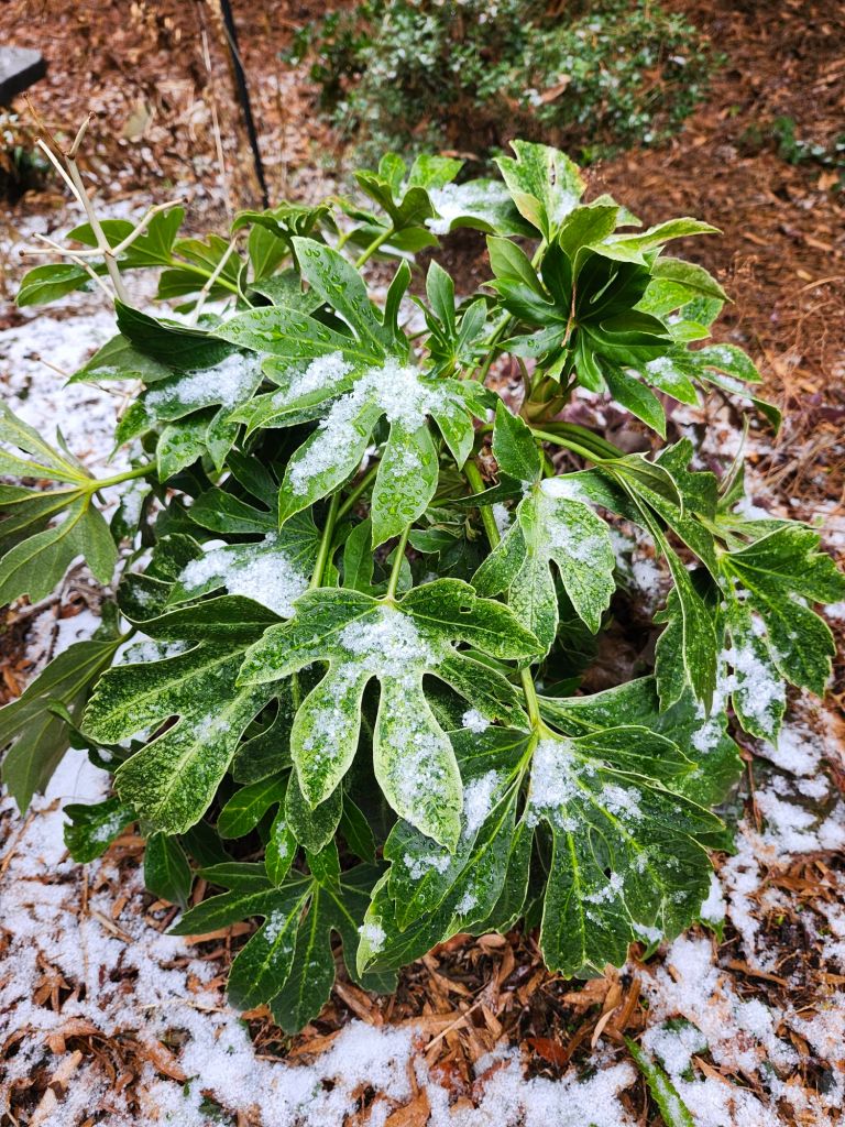 Japanese aralia is impressively resilient. It is amusing, although not too weird, to see it with snow on it.