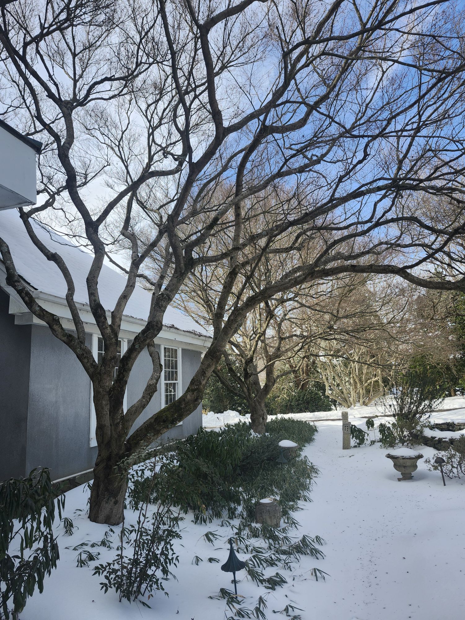 After nighttime temperatures above and just below zero (Fahrenheit), the contrast between the lower rear and shaded side gardens is evident. I am rarely able to discern warmer microclimates, but today flower buds of paperbushes (Edgeworthia chrysantha) down the slope in the rear garden are clearly damaged while no damage is apparent upslope in the side garden. I hope that some buds survive to flower late in February.