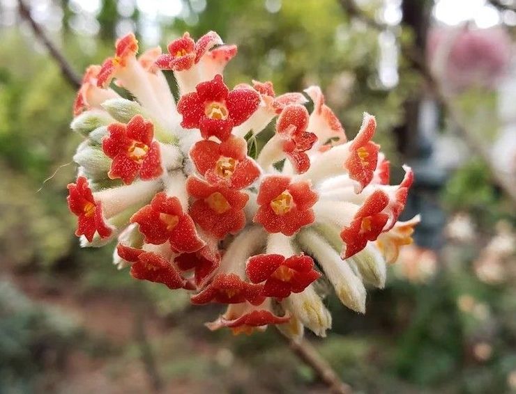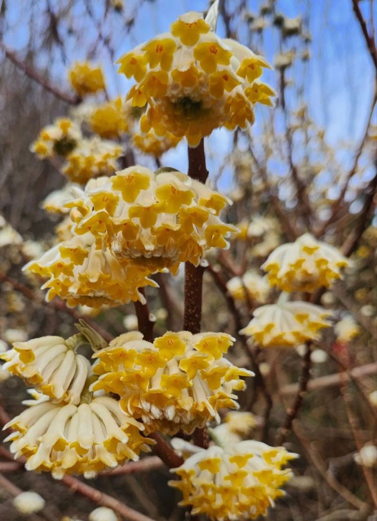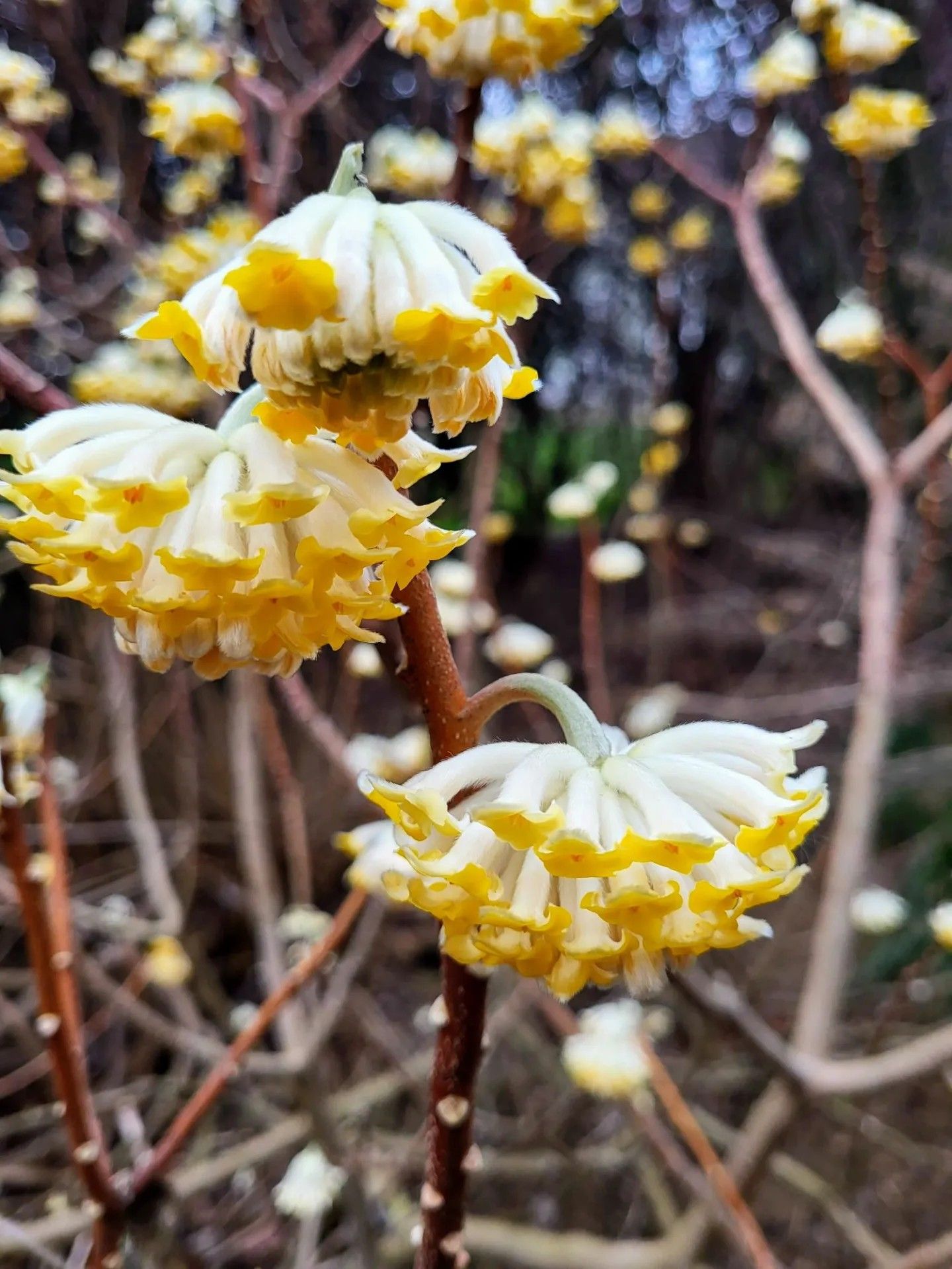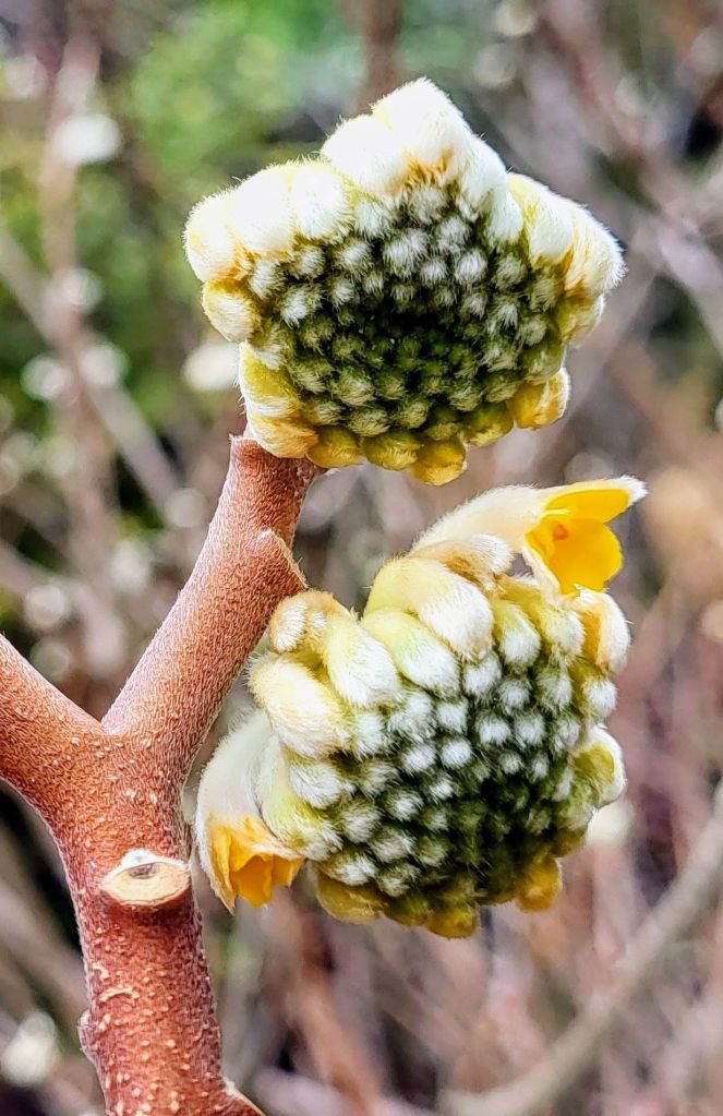 In subsequent years, flower buds have been damaged twice, once with all flowers ruined by temperatures near and slightly below zero. Today, I see damage to the largest and most prominent paperbush, but the extent of the injury is unlikely to be seen for another week or two. Then, it will be time for their glorious late winter bloom. I will be distressed if flowers are lost and if branches must be pruned, but this afternoon I am thrilled that their red-flowered cousin will soon join them.