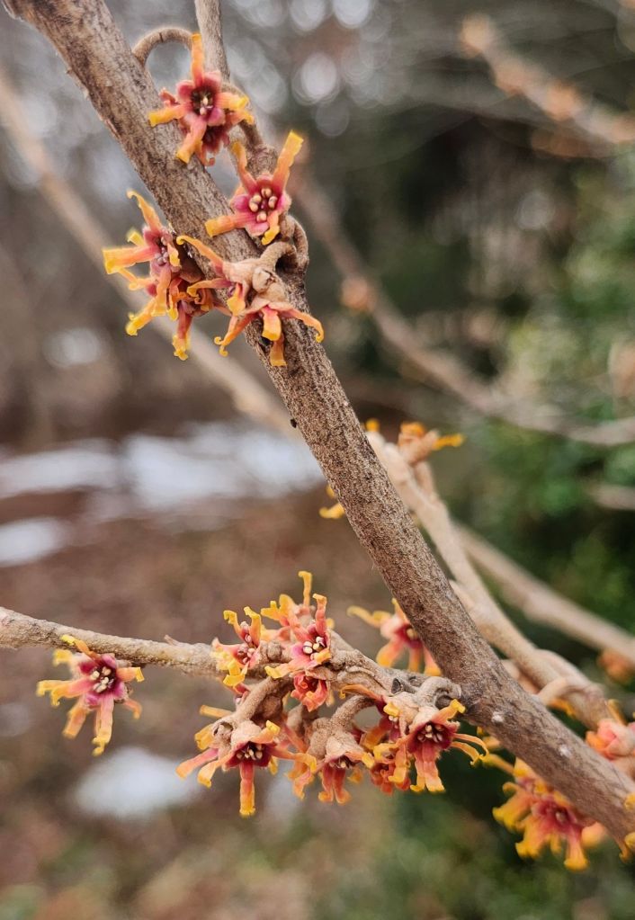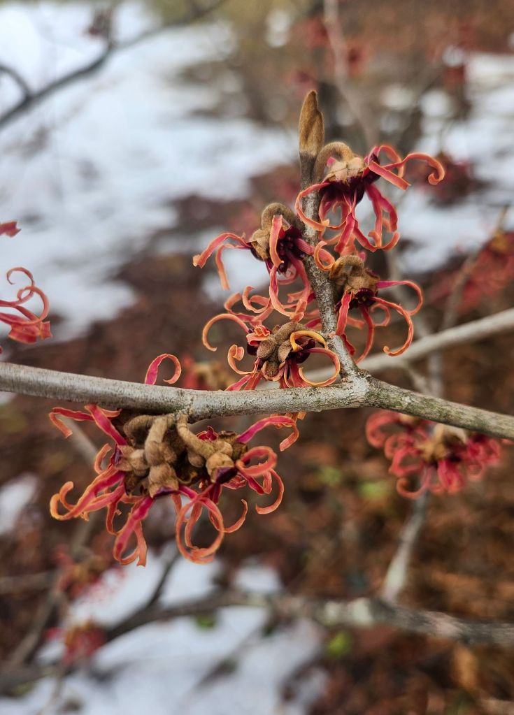 With a few mild and rainy days ahead, I hope that the snow will soon be gone so the garden can get back on track. The warmer temperatures have encouraged flowers of the Ozark witch hazels to open again after being tightly curled for several weeks. ‘Diane’ and ‘Jelena’ witch hazels are flowering, and I expect ‘Arnold Promise’ and ‘Wisley Supreme’ will start in the next day or two.