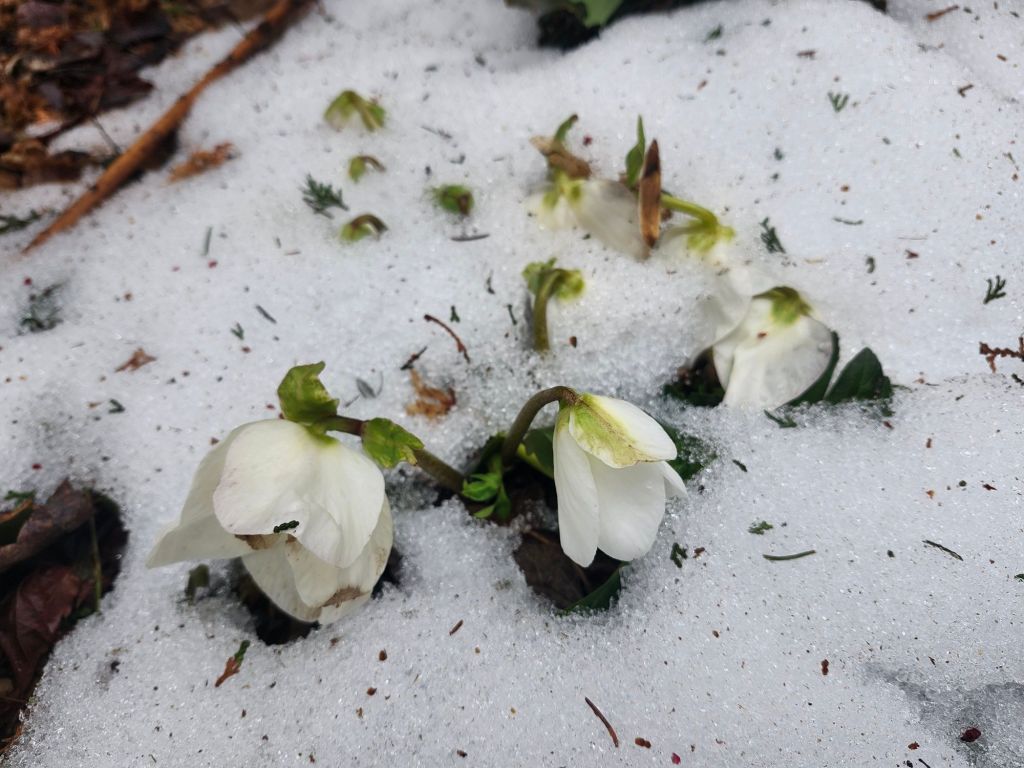 The snow and cold have delayed flowering of the dozens of hellebores that should be flowering. As the snow melts, I see that buds have continued to swell, and flowers that were covered for a few weeks are finally showing through. There hasn’t been enough melting for the snowdrops (Galanthus) and other bulbs to show up, but I expect there will be a rush of color next week. I’m ready for it.