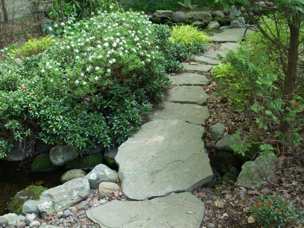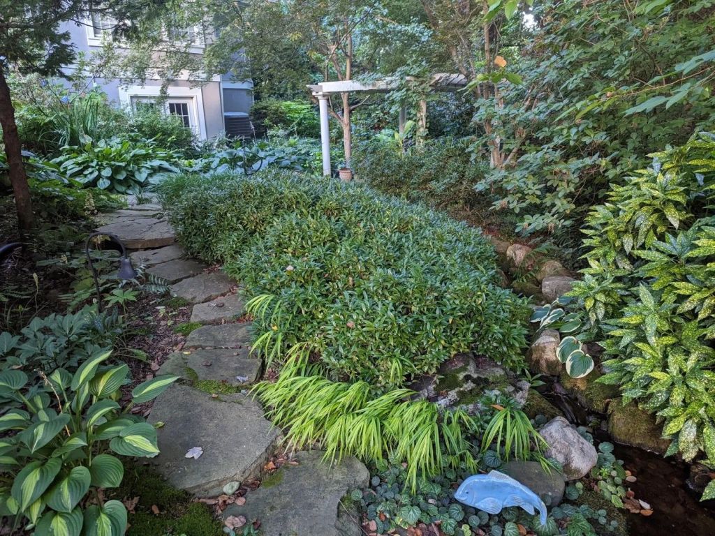 Today, the sweetbox has become a spreading, rounded green mass constrained by the stream to one side and by the removal of suckering stems that attempt to creep through the stone path to the other. While the small, late winter blooms are a sensory joy to those who can smell, this prominent space would be more ornamental with more colorful or textural choices. But, it took a long time to get here. I must take another decade or so to enjoy the reward of the years of waiting.