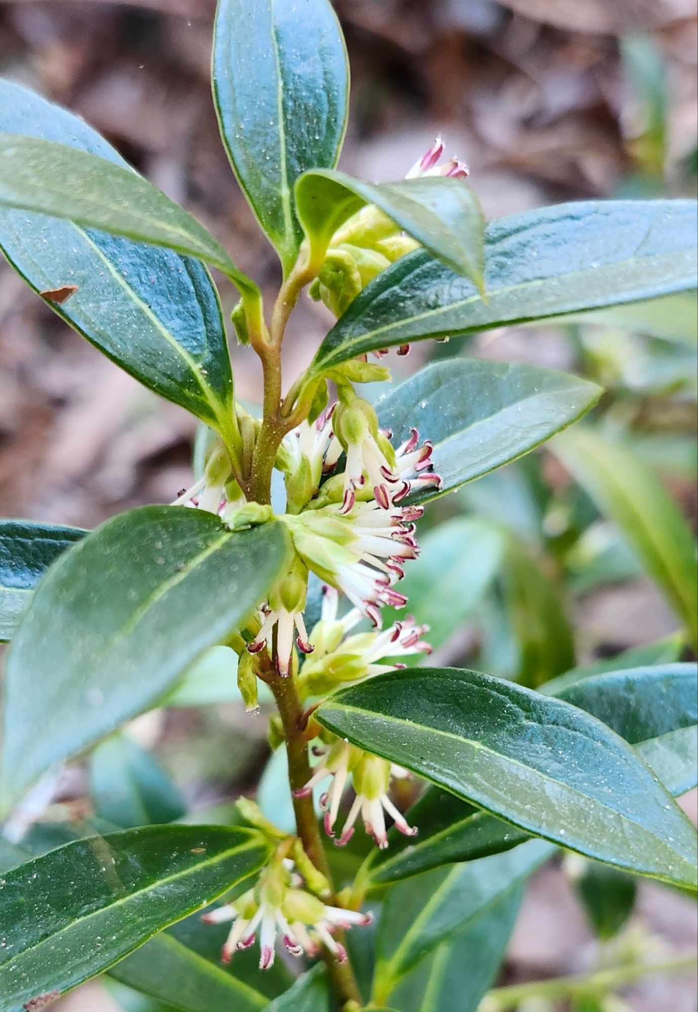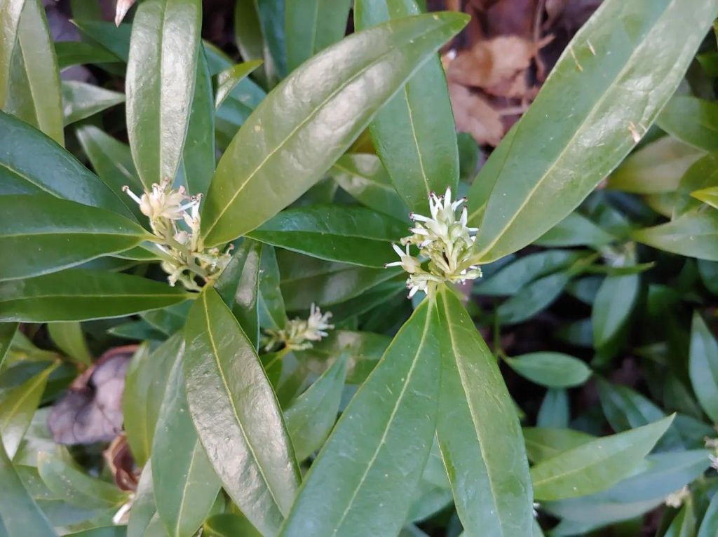 The flowers of sweetbox don’t make much of a show, but like a few other blooms they’re a signal of spring’s arrival. Several branches have been snipped to be set in a small vase in the kitchen. Even indoors, I doubt I’ll be able to smell the very fragrant blooms.