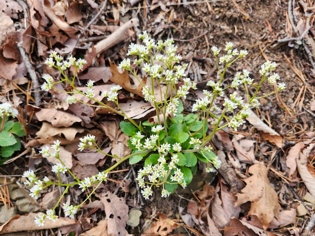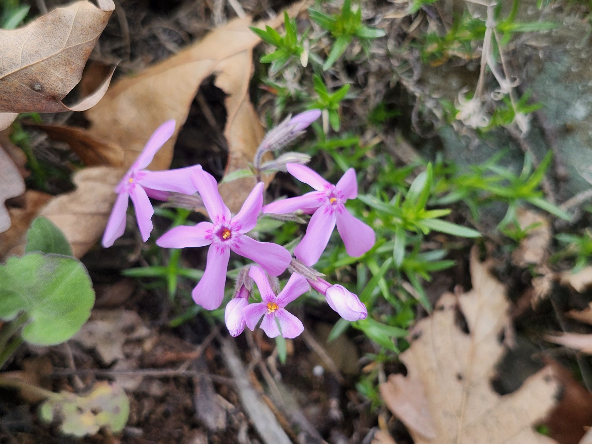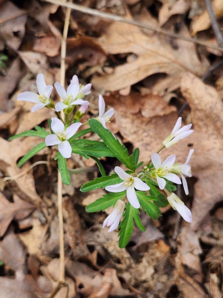 Missing from today’s hike were most of the ephemerals we expected at lower elevations. There were abundant toothworts (Cardamine concatenata, below), but few of the blooms we saw on this trail a year ago (and two weeks later). But, the bonus today was a number of flowers on the trail’s midsection (at ~1400 feet elevation).