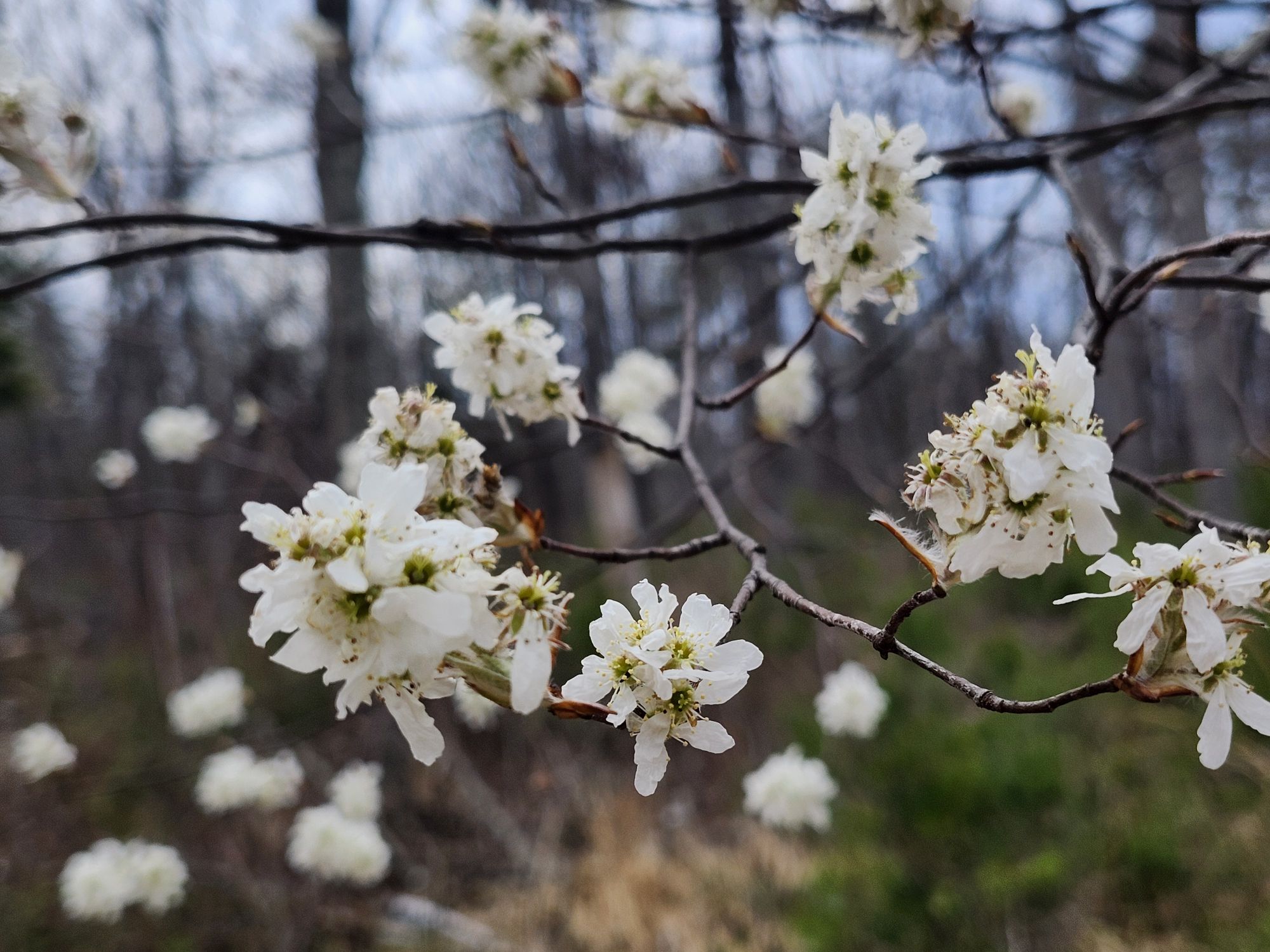 While serviceberries (Amelanchier canadensis, above) in our garden are not flowering yet, we were delighted to see many, from the bottom to top of the mountain. With leaf buds of trees just beginning to crack open, we were happy to see the serviceberries in bloom. (Note – tree growers that I worked with for many decades always called these sarviceberry which I see now is an accepted common name for it.)