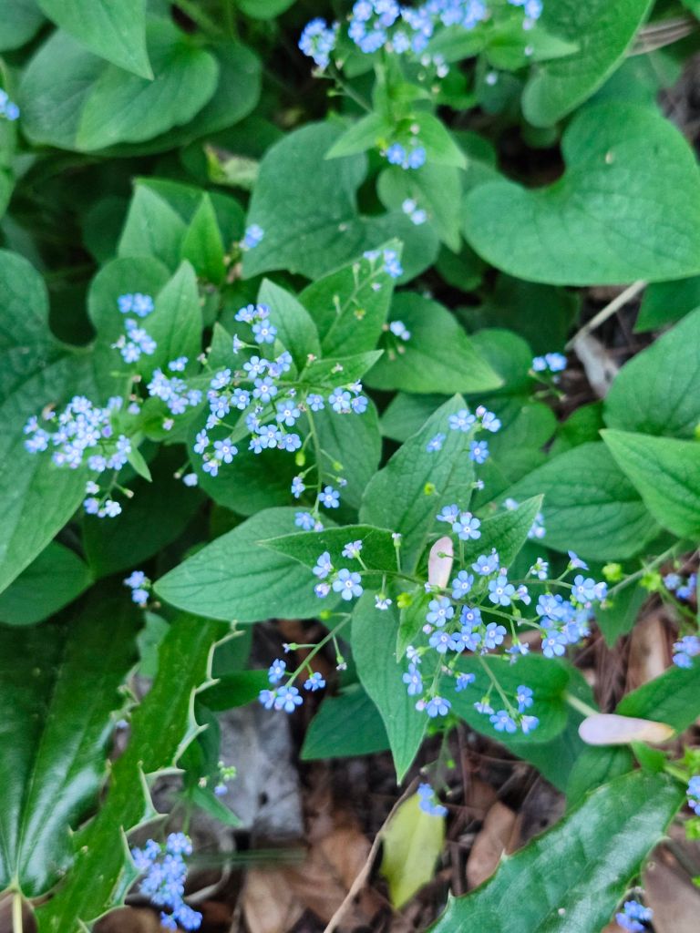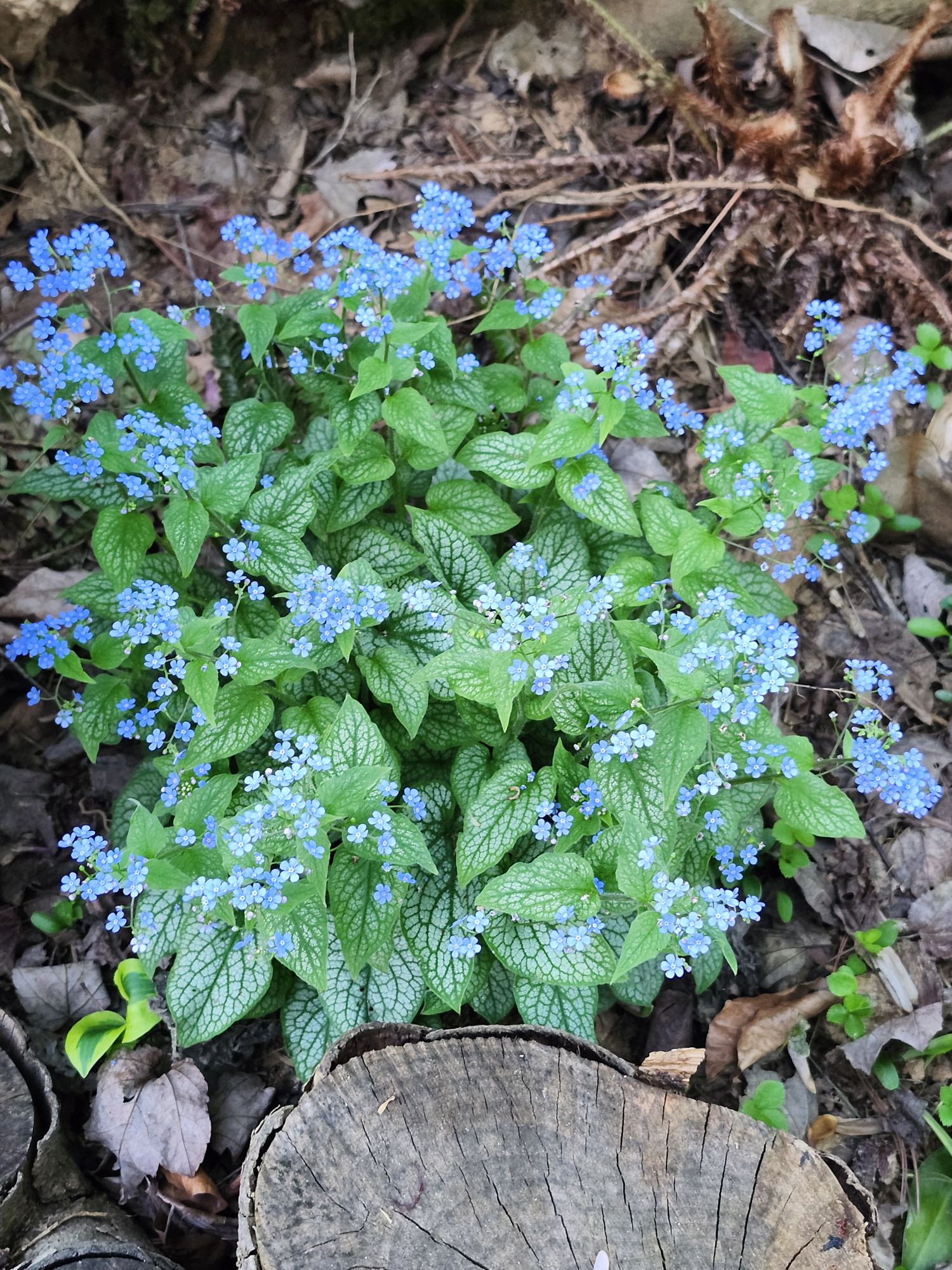 A few neglected silver-leafed brunneras (Brunnera macrophylla ‘Jack Frost’) have reverted to green (above), but look at it. How could I be unhappy with its cheerfulness. A third retained its variegated foliage (below). It was transplanted in early autumn to the new stumpery that is far over planted, but that will be easily rectified. Here, the brunnera stands out, but with ferns, hostas, and heucheras just getting started. Certainly, too much, but for now joyfully overfilled.