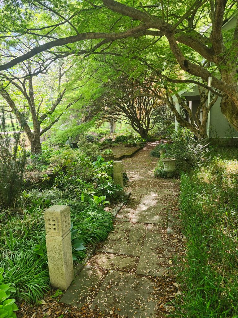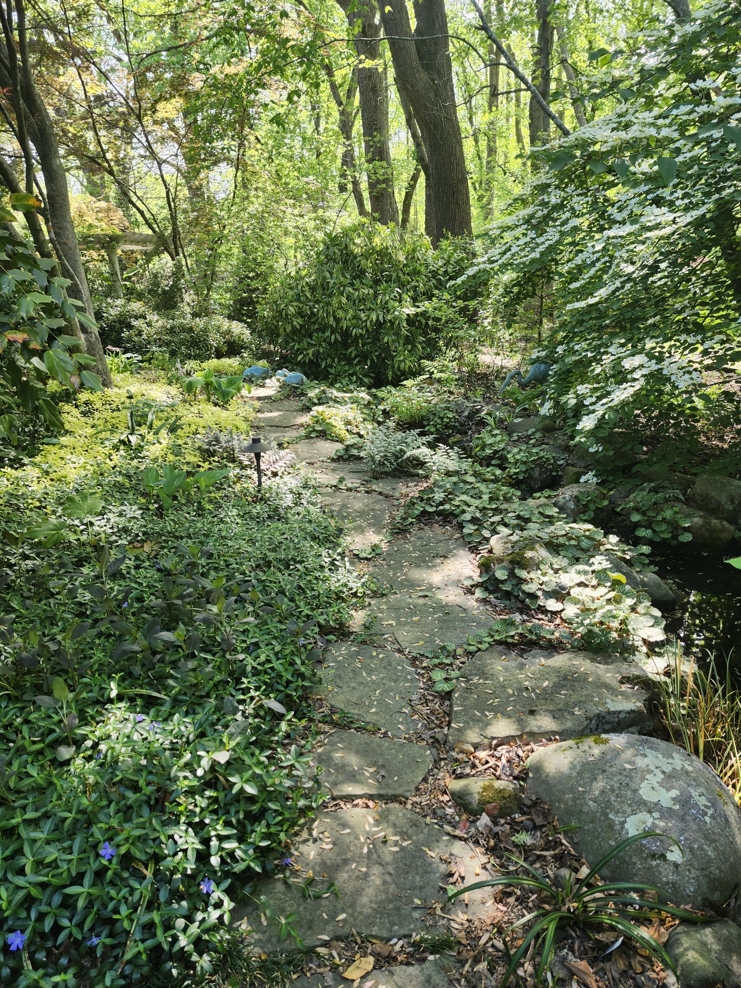 The stone paths are a wretched mess (above), stones wobbling and irregularly spaced, demanding a warning before any visitor takes a step. The ponds are littered with leaves. Sooner, possibly later, I will get around to scooping them out. I hired this out in the past, but in retirement I should have so many hours available to tend to such chores.