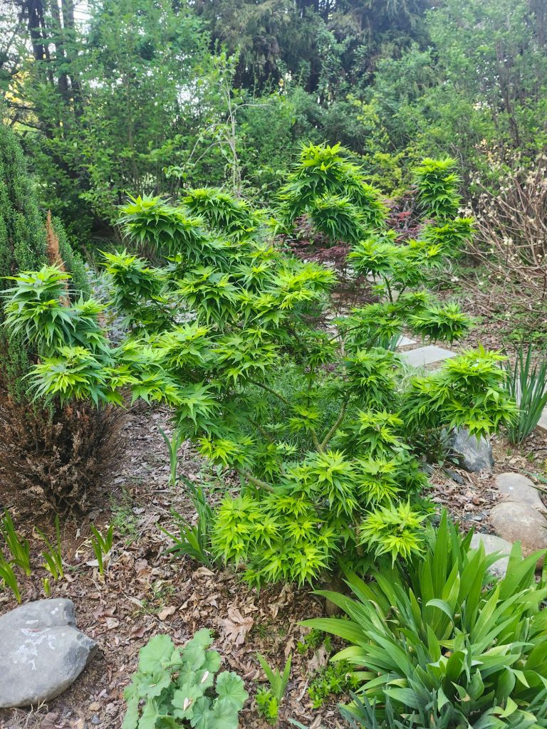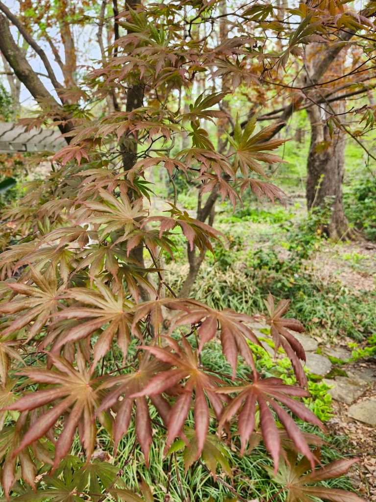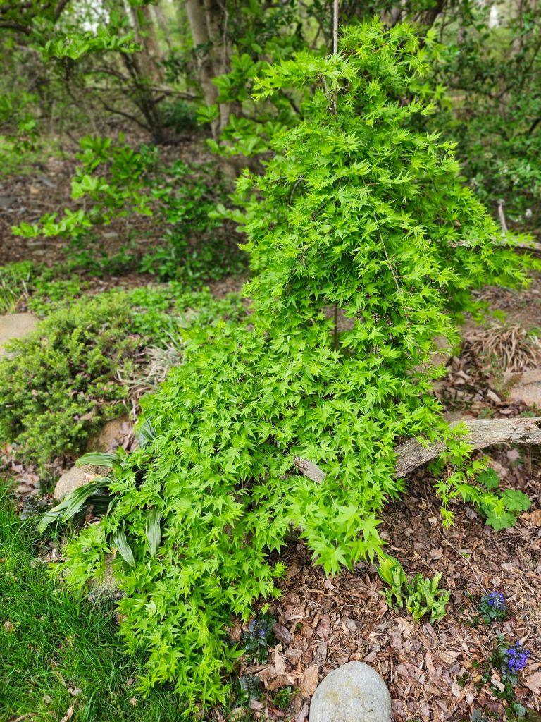 In recent years, I’ve added a few maples in containers that sit on the patios, but someday these will need a home in the ground. In autumn, I purchased a group of small, grafted maples that were heavily discounted to grow in my small nursery area. I have no clue what I’ll do with these. It seemed at the moment like a good idea, and one was recently gifted to our youngest son. I advised our older son to wait a year for a larger tree.