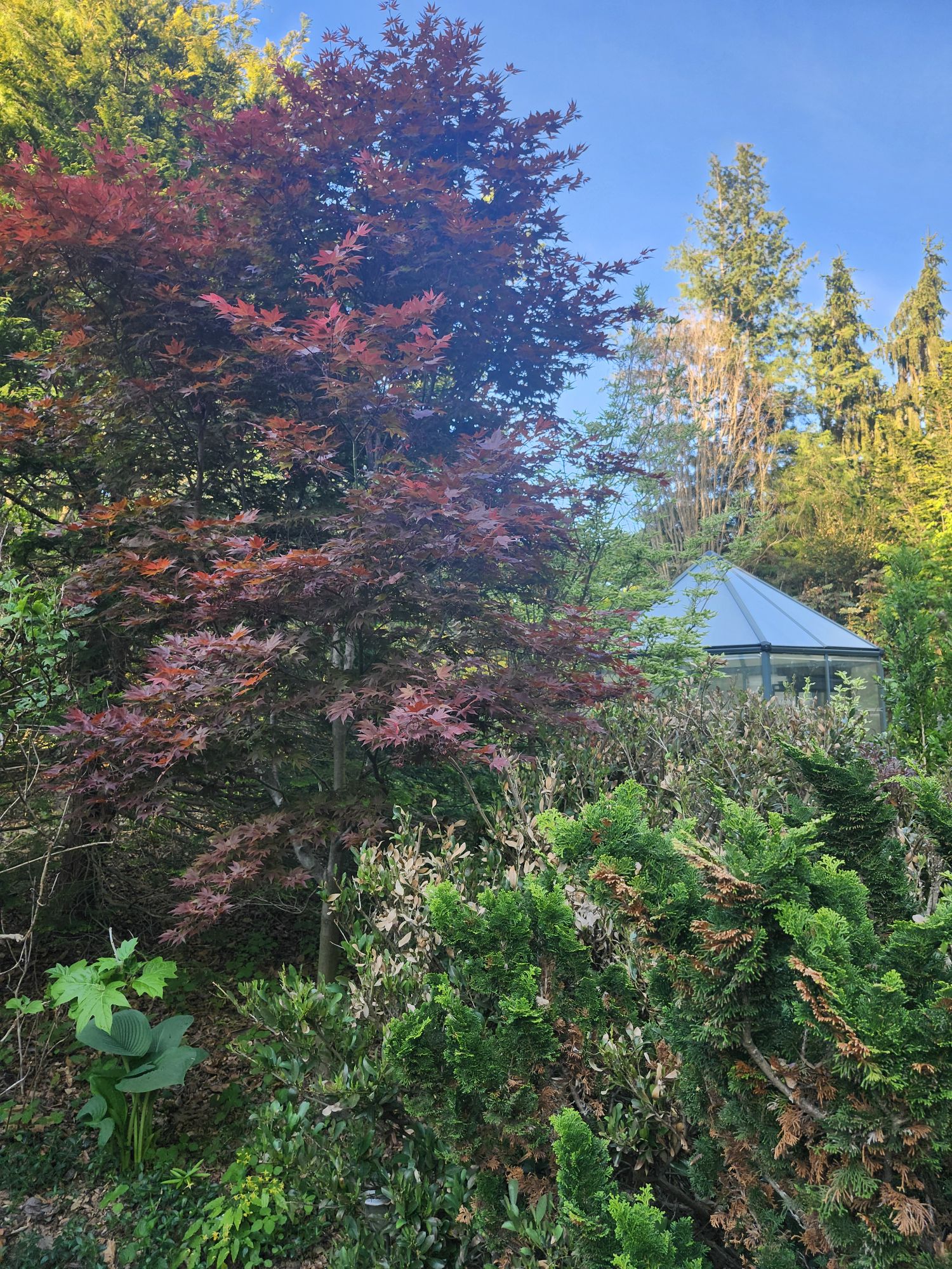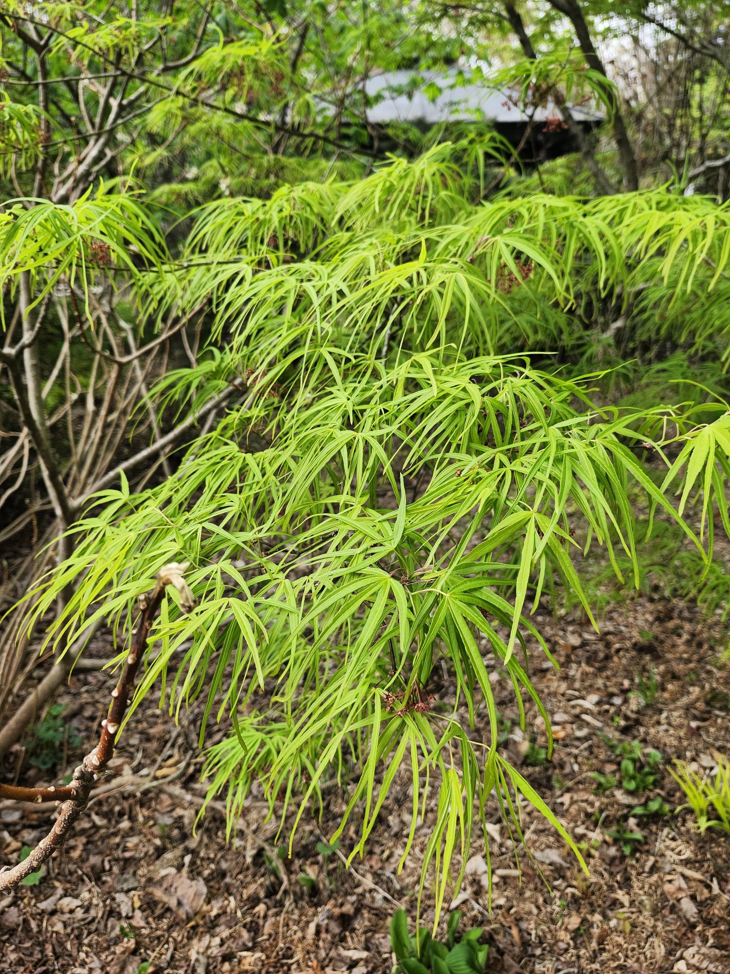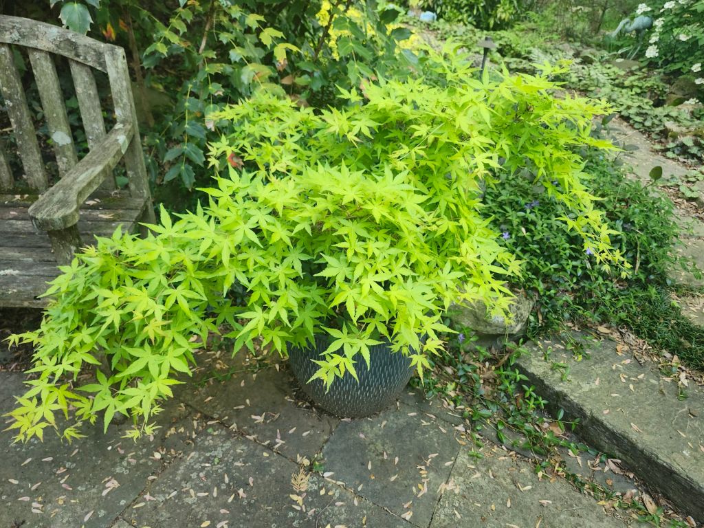 My Ryusen backs to the forest, so it grows only on the side facing the garden. This works for me, but if you want to give it more space it can be transplanted after its foliage drops in autumn and before spring growth. A small tree might be moved in leaf with extra care and very regular watering, but it’s taking a chance. Japanese maples are very tolerant of transplanting, but the weight of a large tree can make this difficult.
