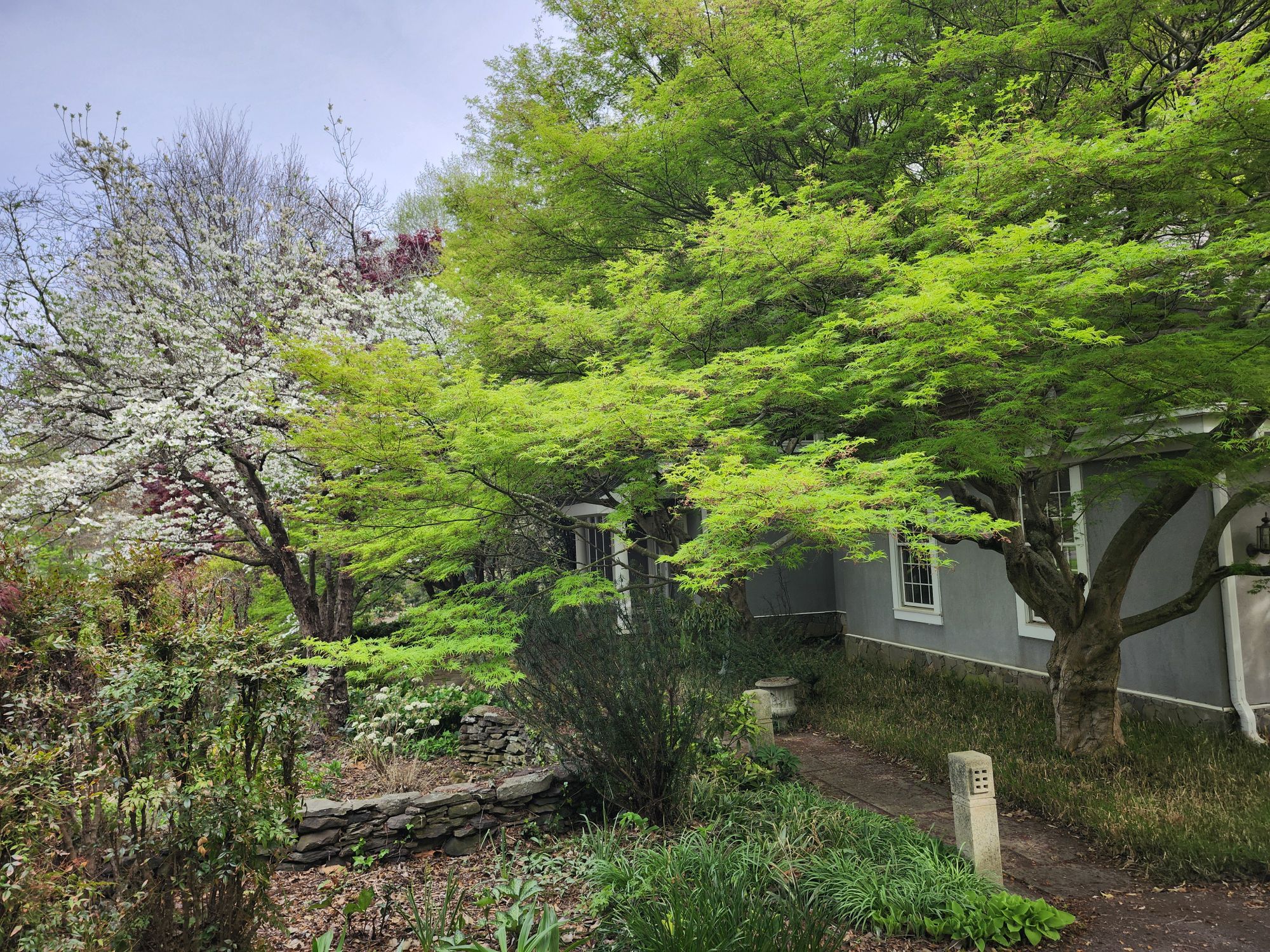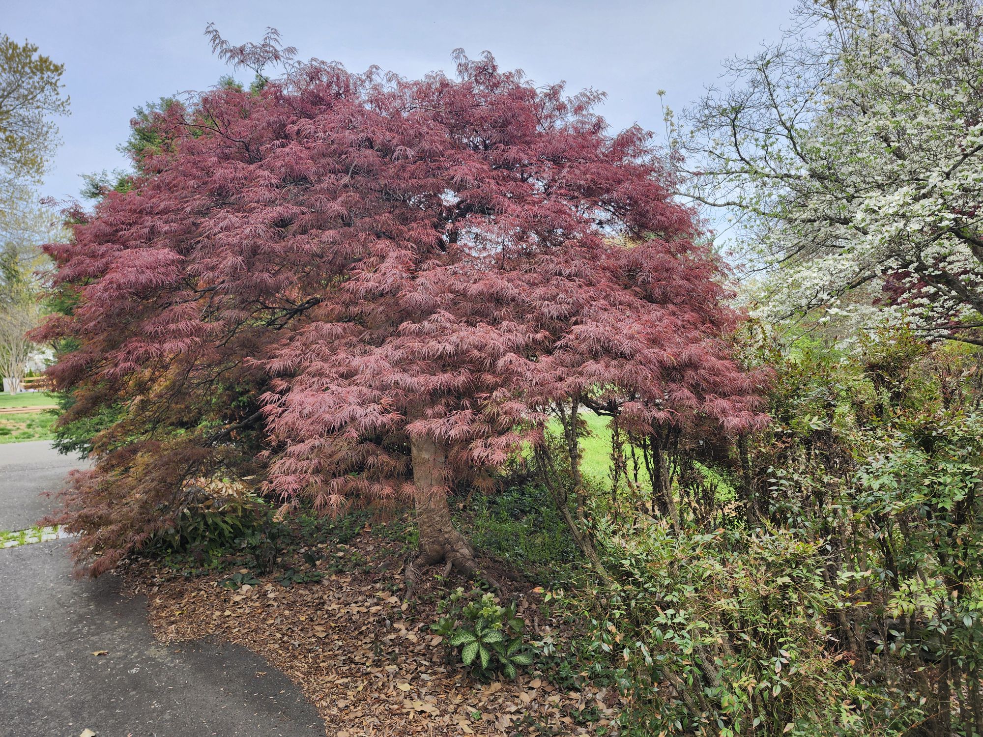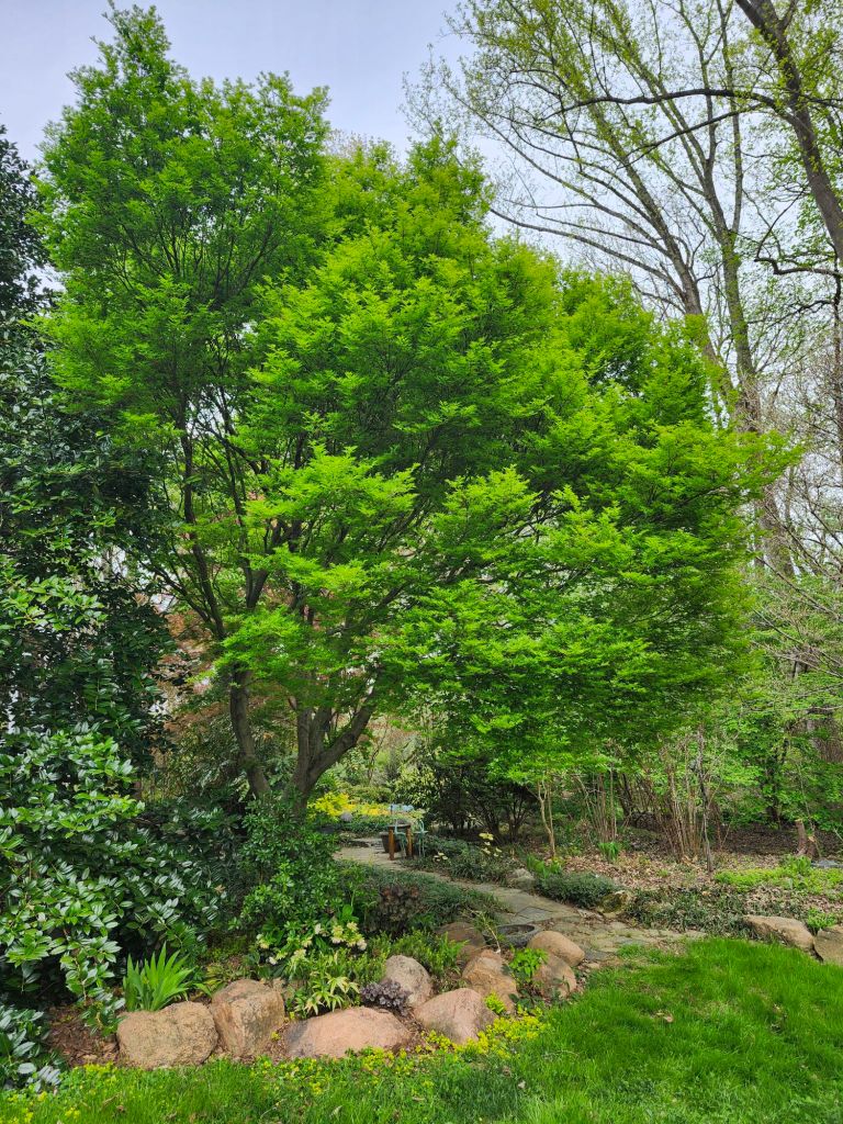 I often imagine the garden expanded by several acres (a fantasy only), and here there would be many more Japanese maples, but also additional dogwoods, redbuds, and magnolias. No doubt, I’ve planted trees closely, but with rare exception each tree has room to show its best form. And, that’s after thirty-seven years with many maples three decades and older.