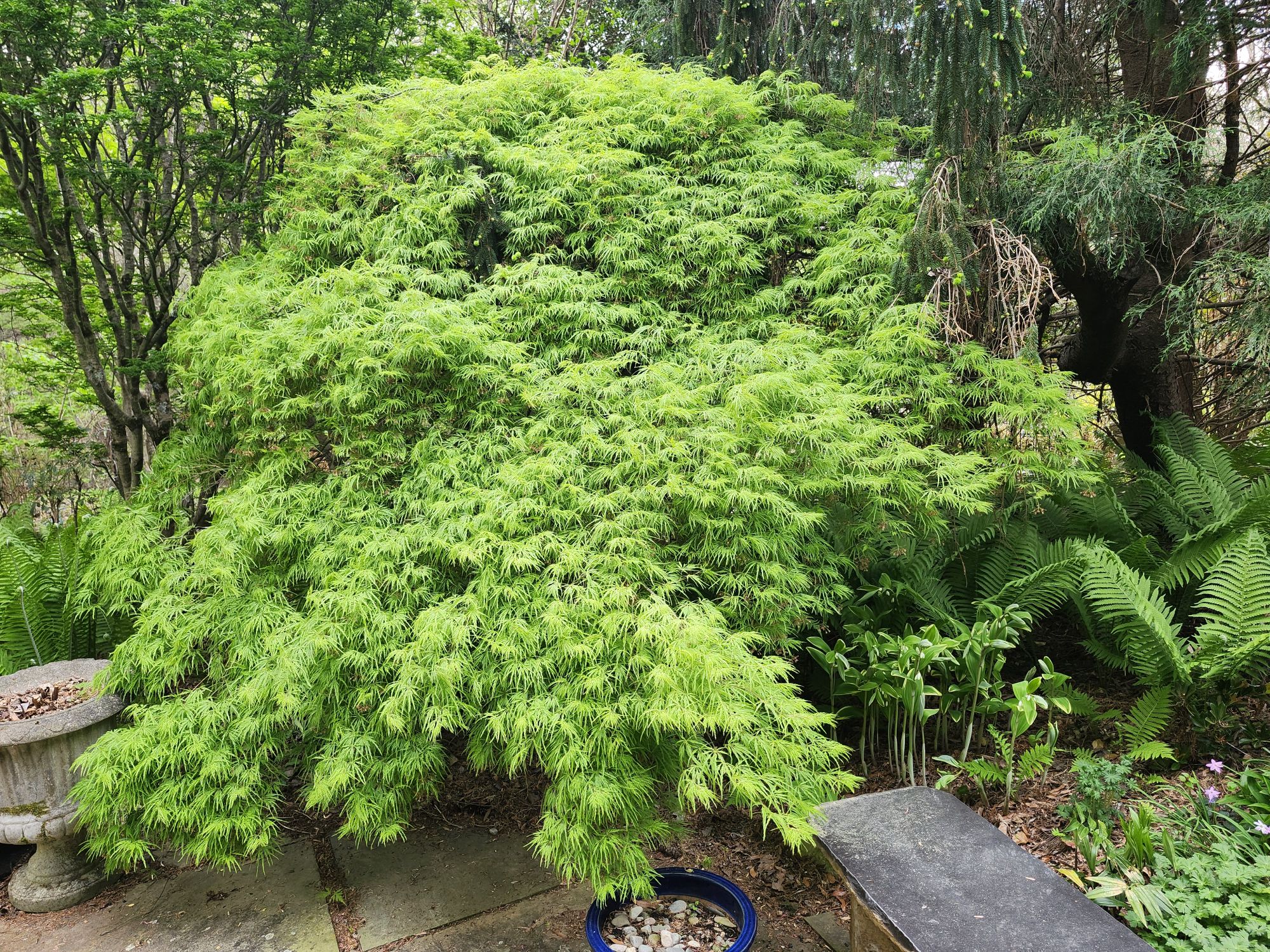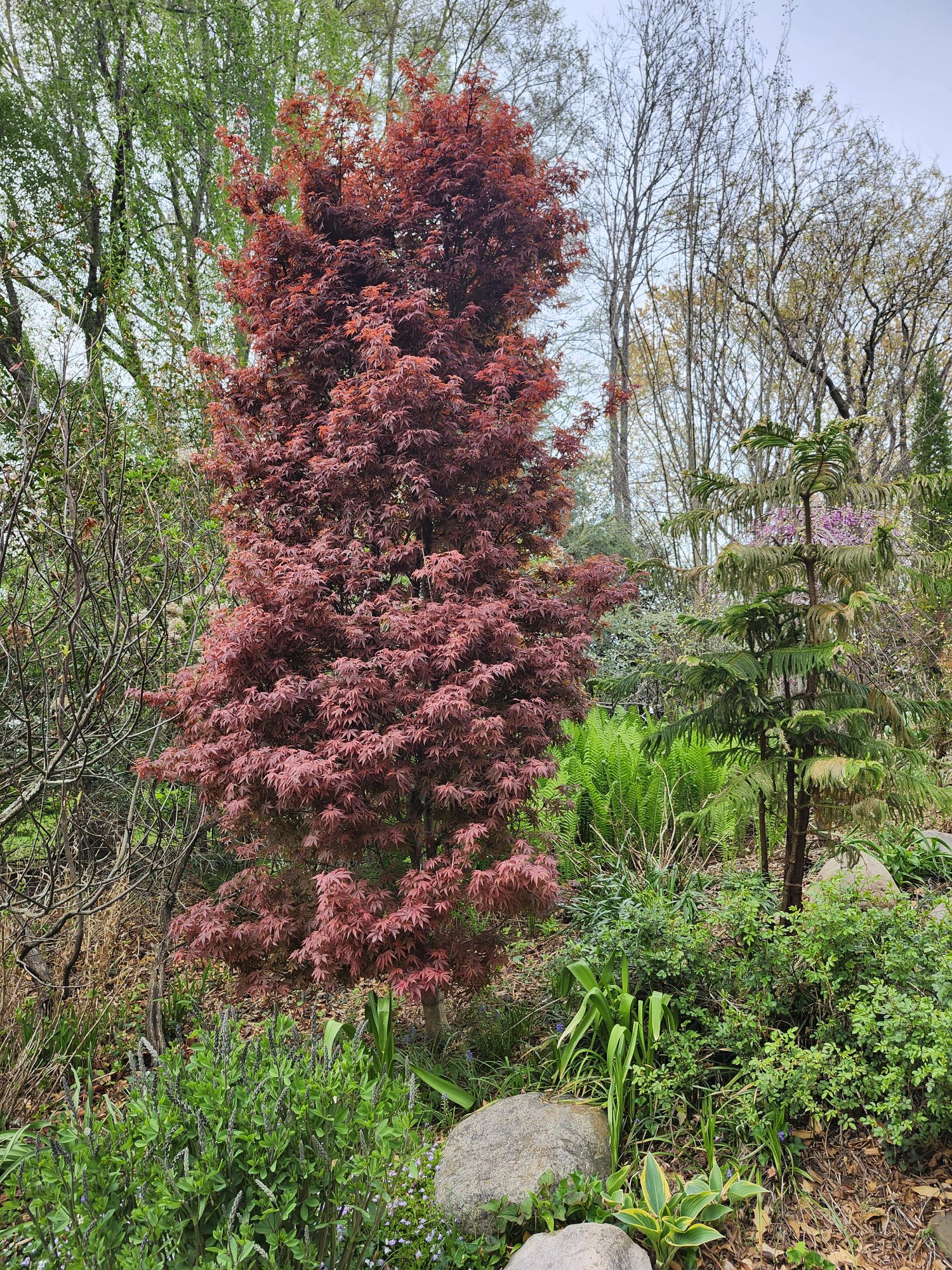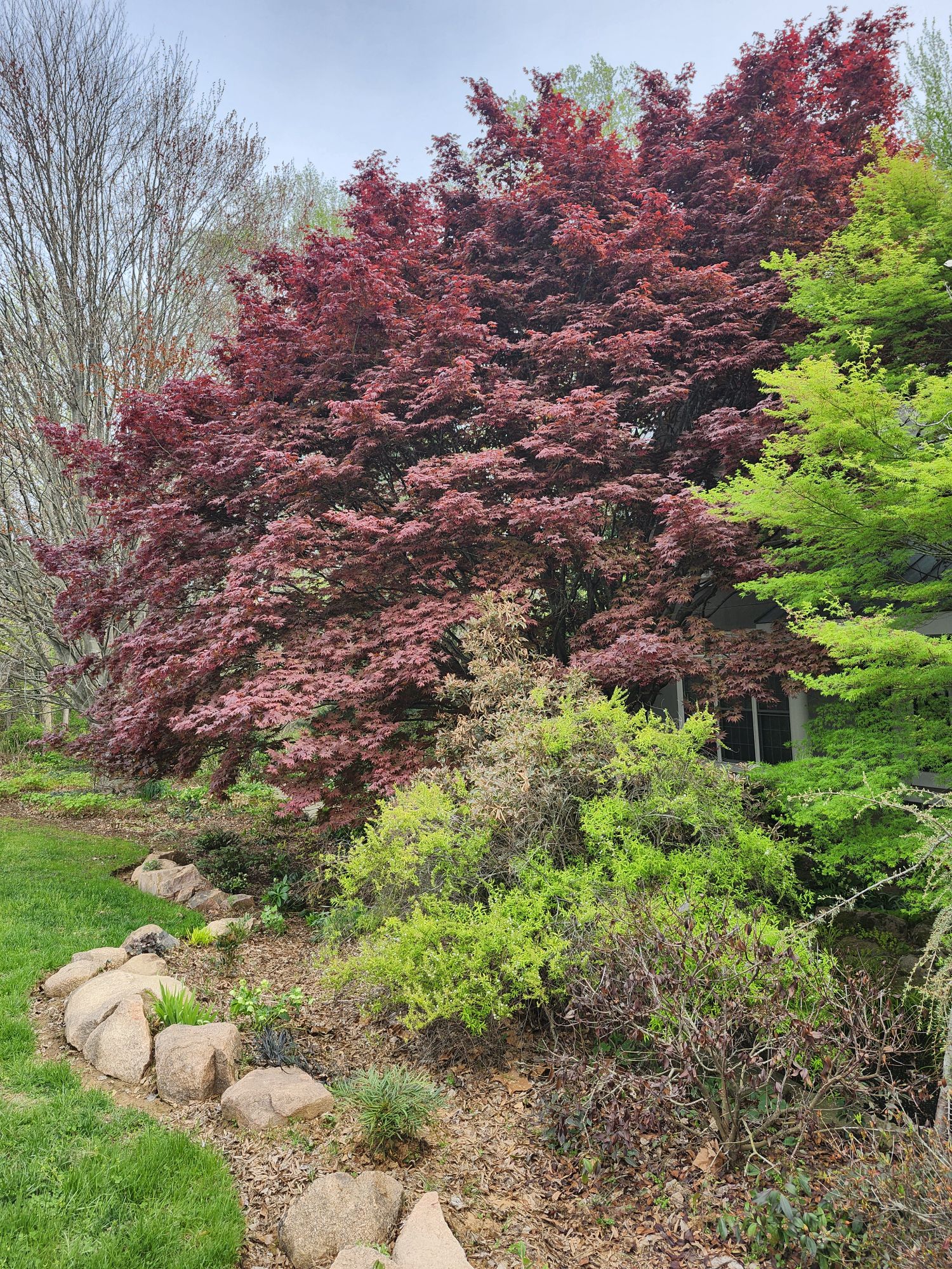 I often imagine the garden expanded by several acres (a fantasy only), and here there would be many more Japanese maples, but also additional dogwoods, redbuds, and magnolias. No doubt, I’ve planted trees closely, but with rare exception each tree has room to show its best form. And, that’s after thirty-seven years with many maples three decades and older.